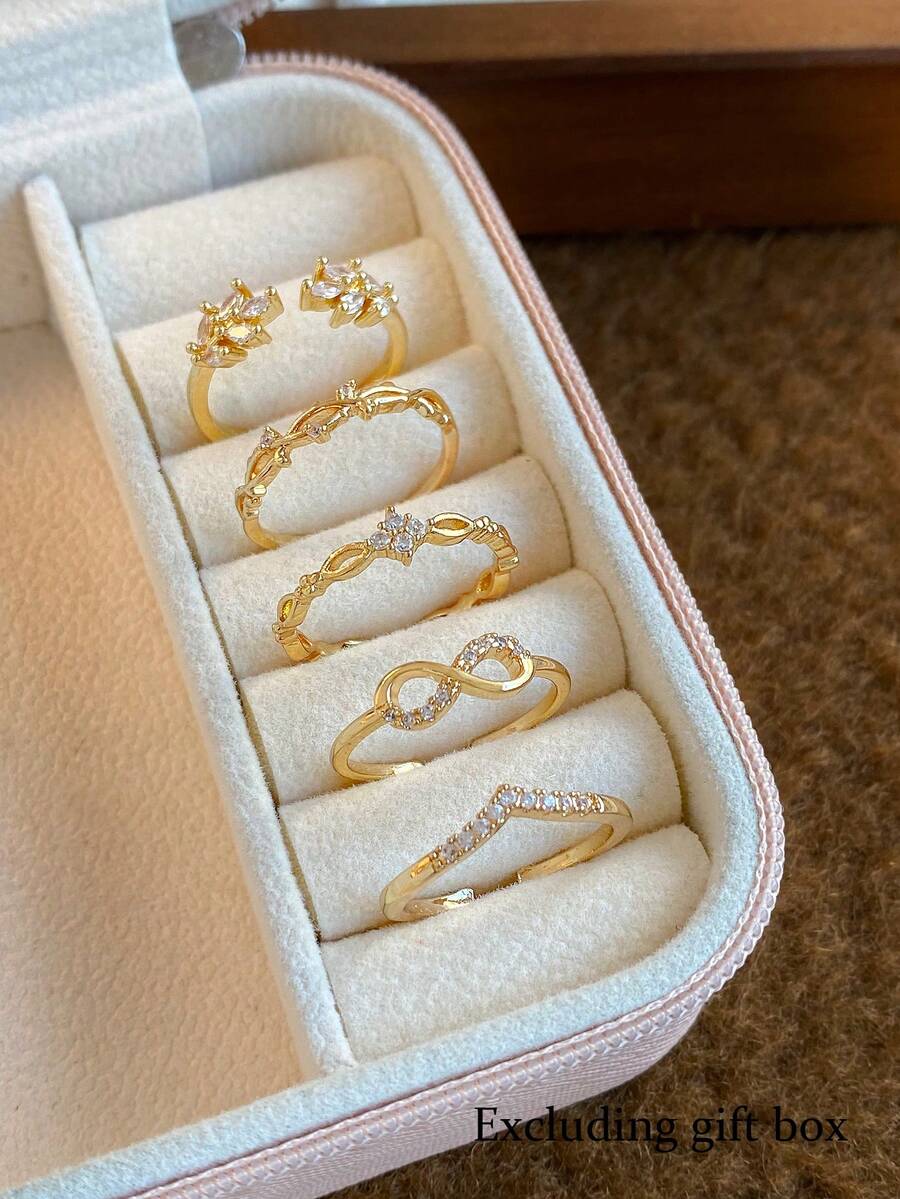 مجموعة أنيقة من خمسة خواتم فريدة، بتصميم رقيق يمكن فتحه وإغلاقه، مناسبة للاستخدام اليومي والمناسبات والعطلات وتقديم الهدايا. مصنوعة من النحاس ومطعمة بزركونيا اصطناعية لإطلالة لامعة راقية. (بدون علبة هدايا)
