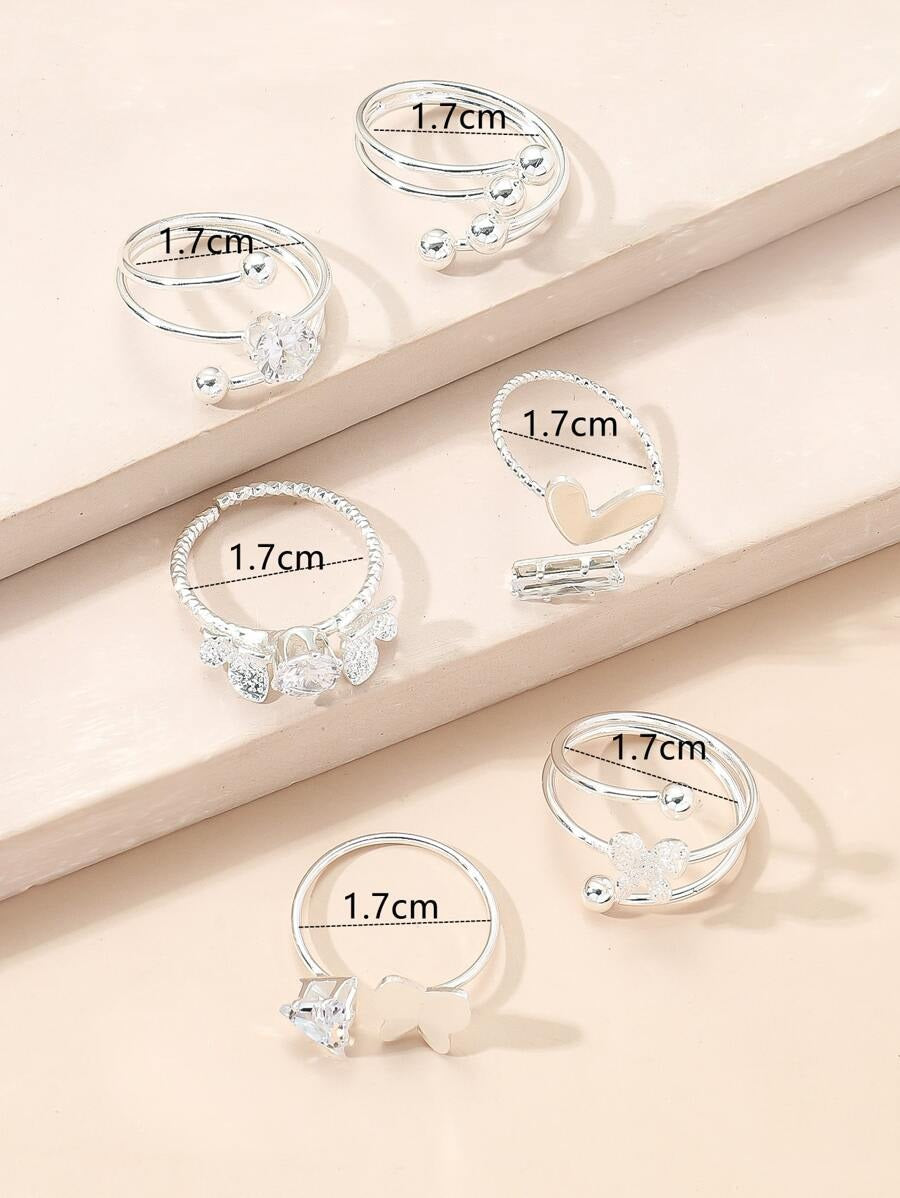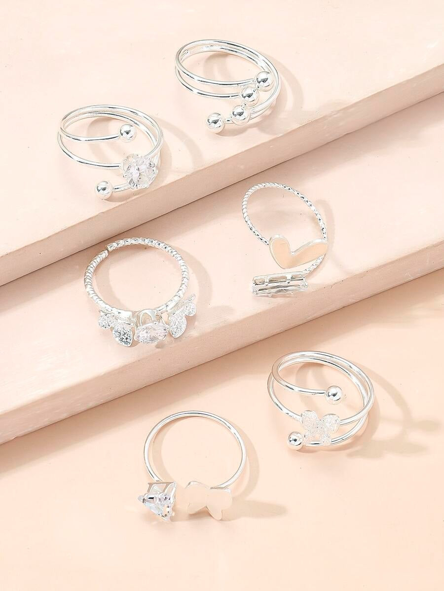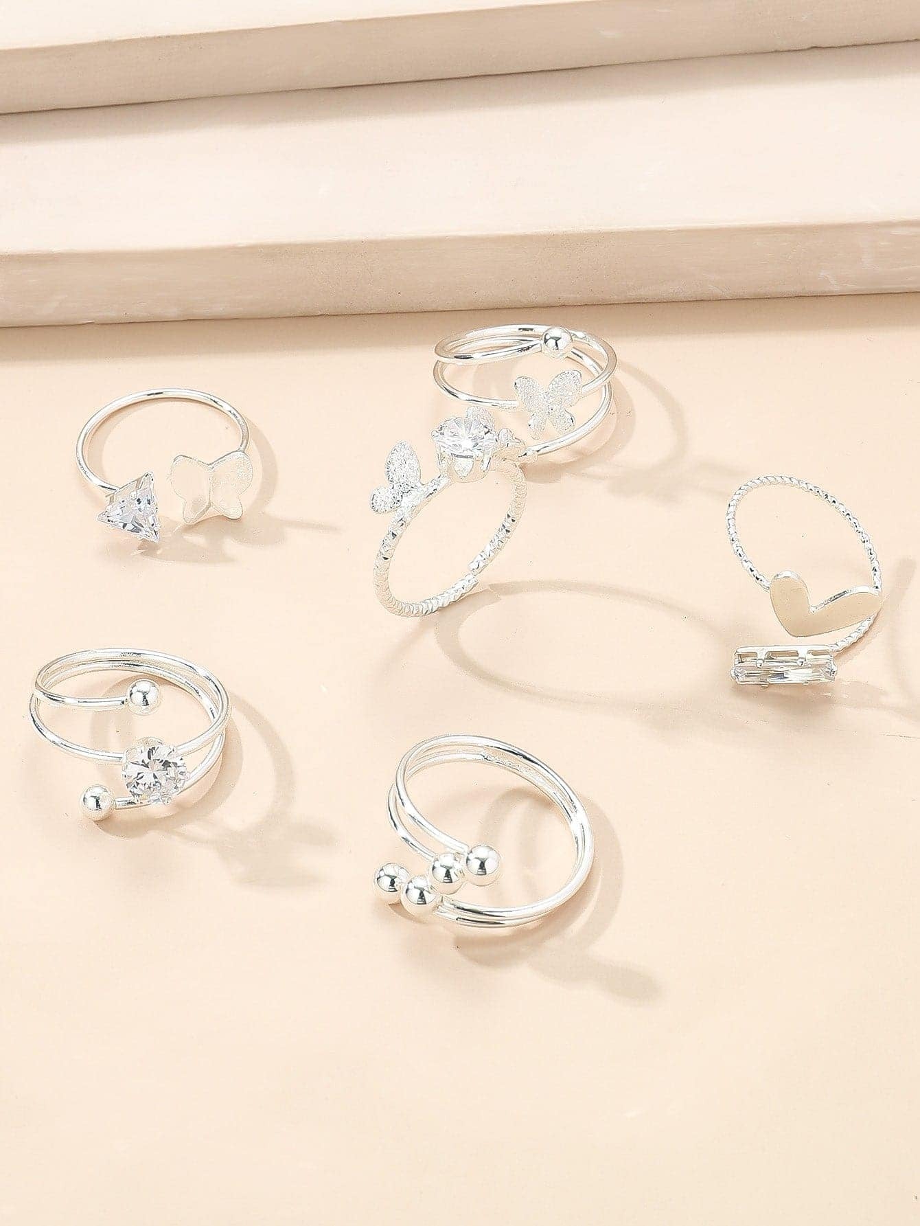 SHEIN طقم 6 خواتم فضية فراشة وزركونيا