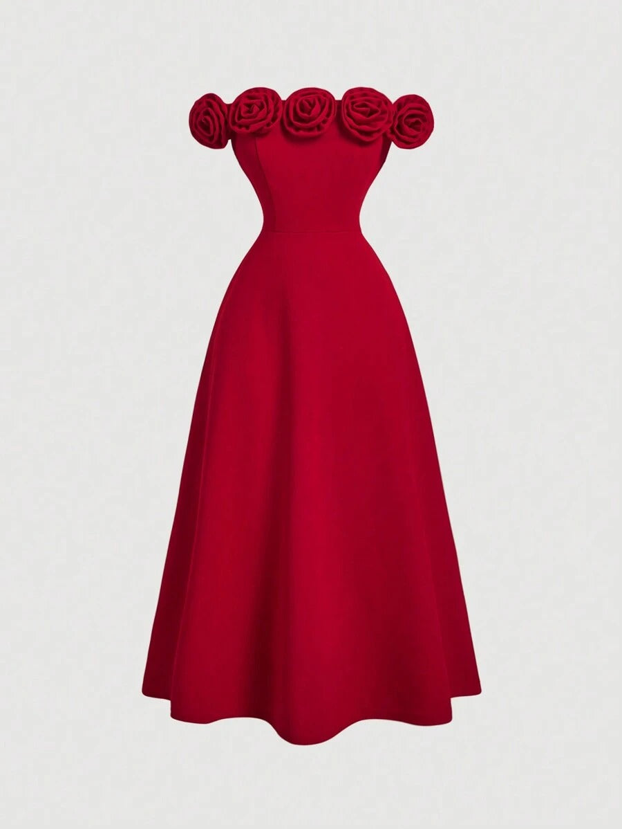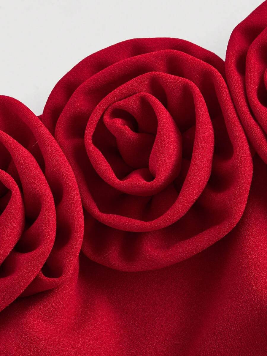 ❤️ SHEIN MOD – فستان أحمر متدفق مزين بزخرفة زهرية ثلاثية الأبعاد