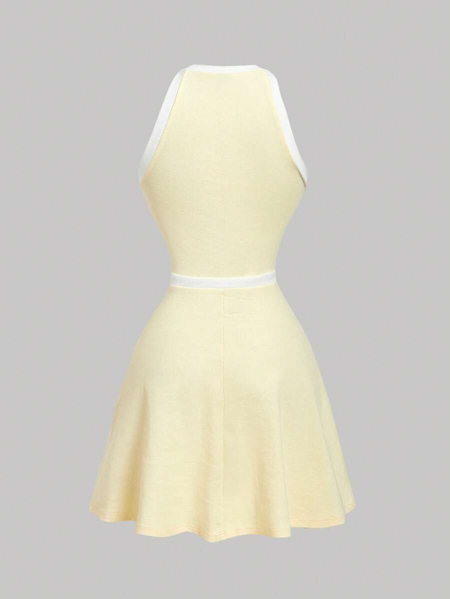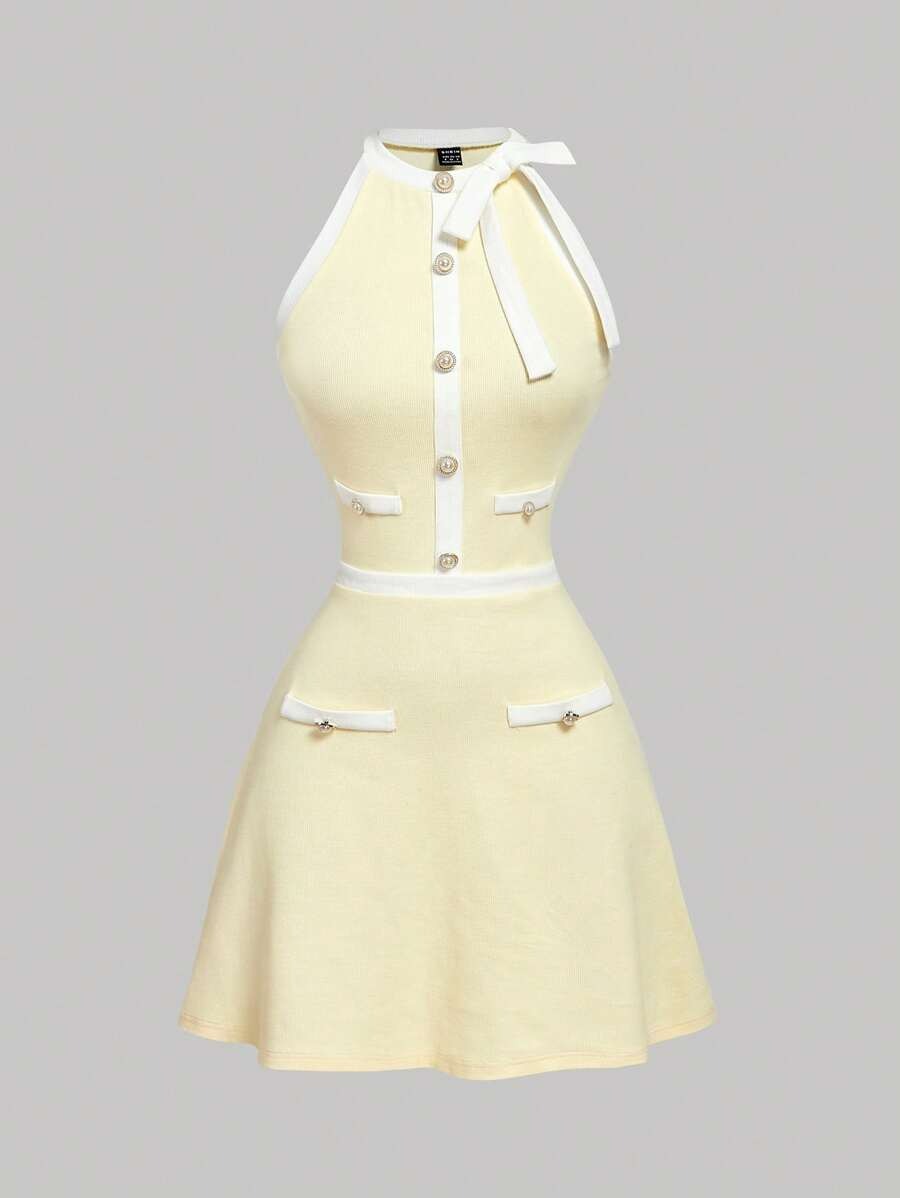 SHEIN فستان أصفر قصير بدون أكمام بتفاصيل أزرار ورباط