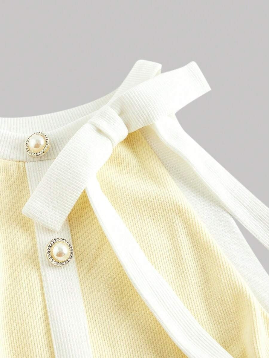 فستان أصفر قصير بدون أكمام بتفاصيل أزرار ورباط 🎀
