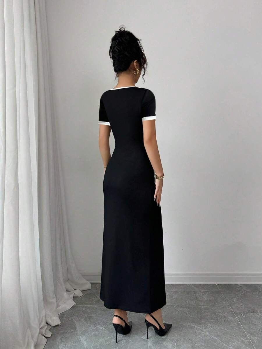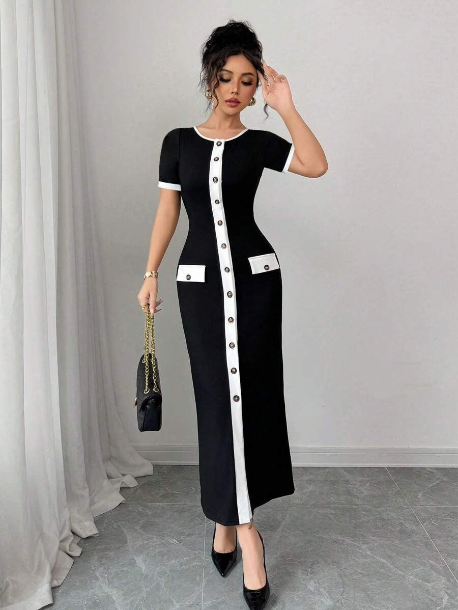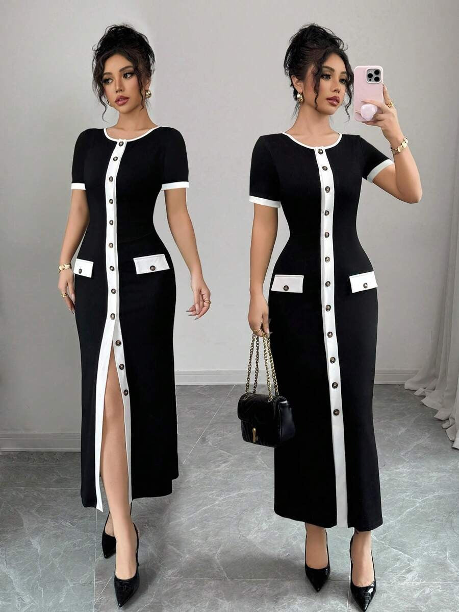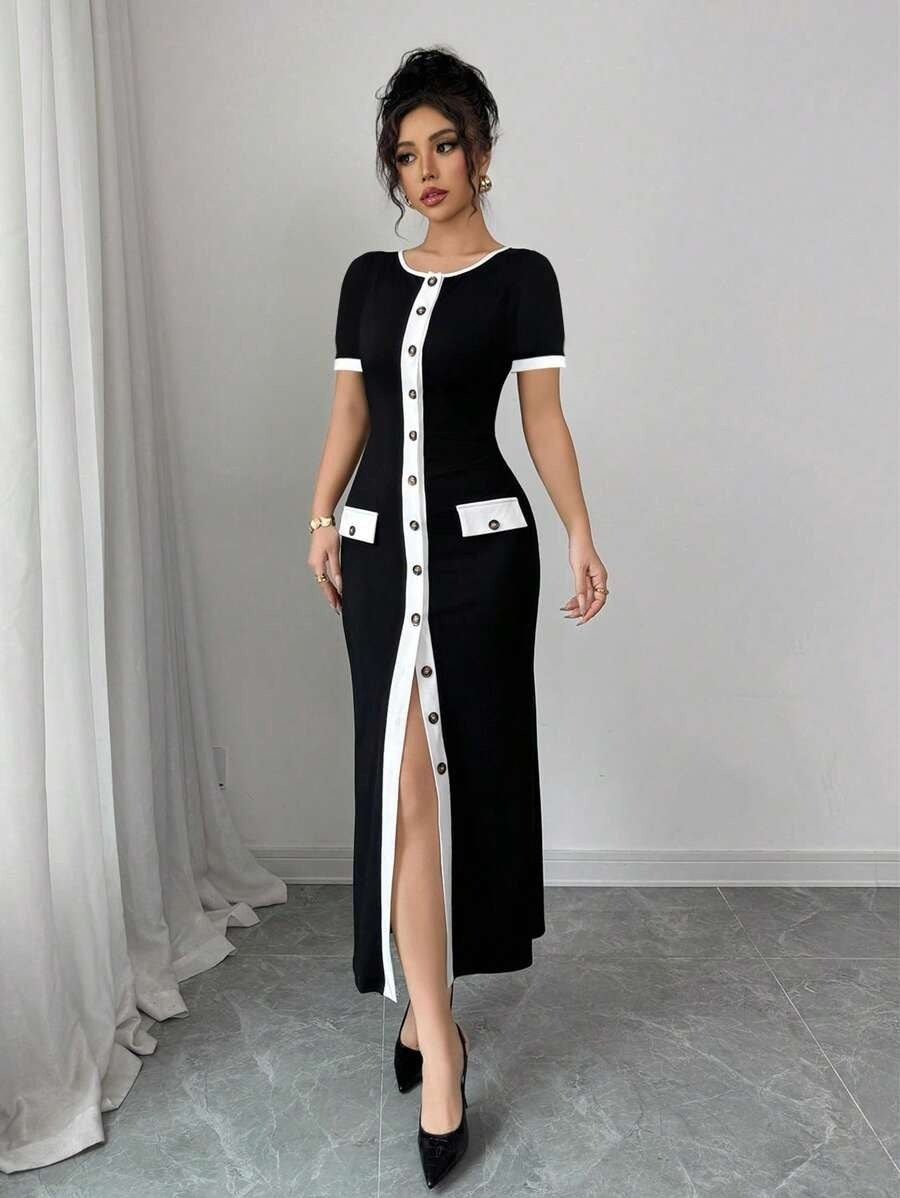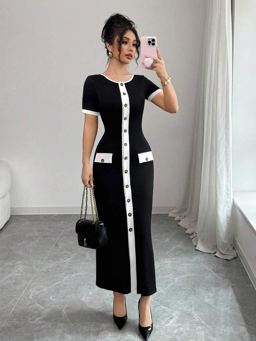 SHEIN فستان أنيق باللون الأسود و الأبيض مزين بأزرار أمامية