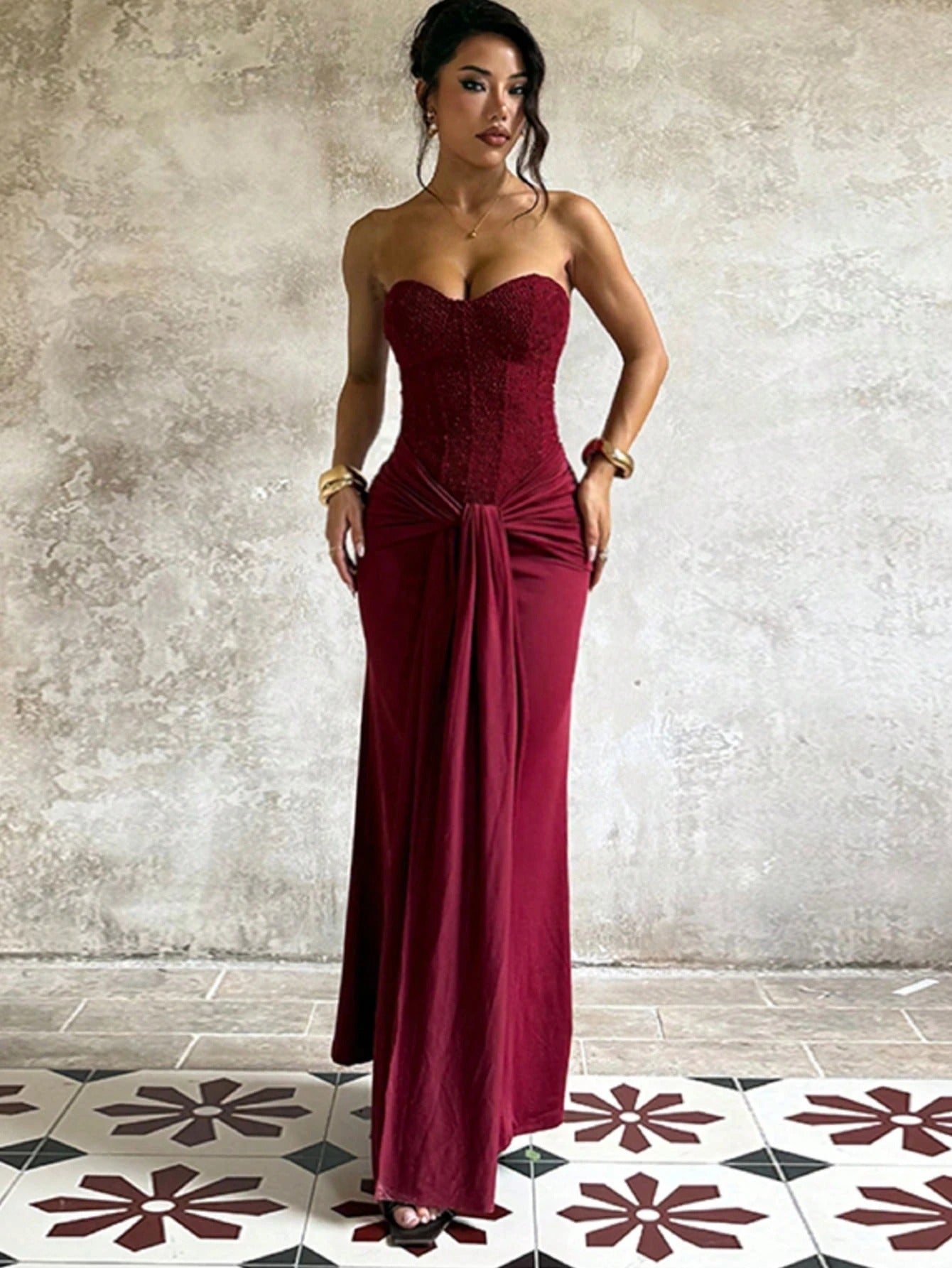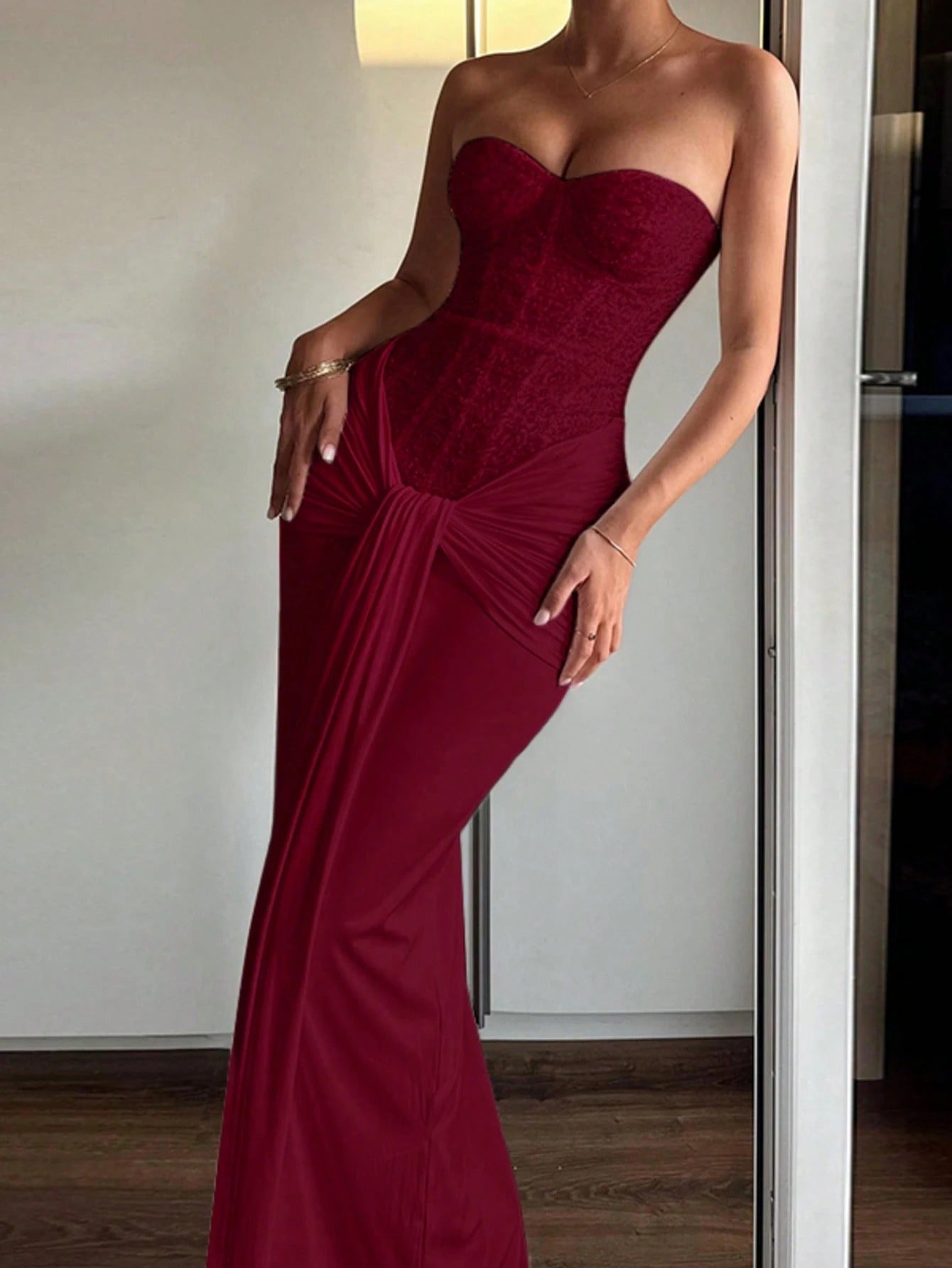SHEIN فستان عنابي أنيق بسحاب خلفي من قماش محبوك ملون