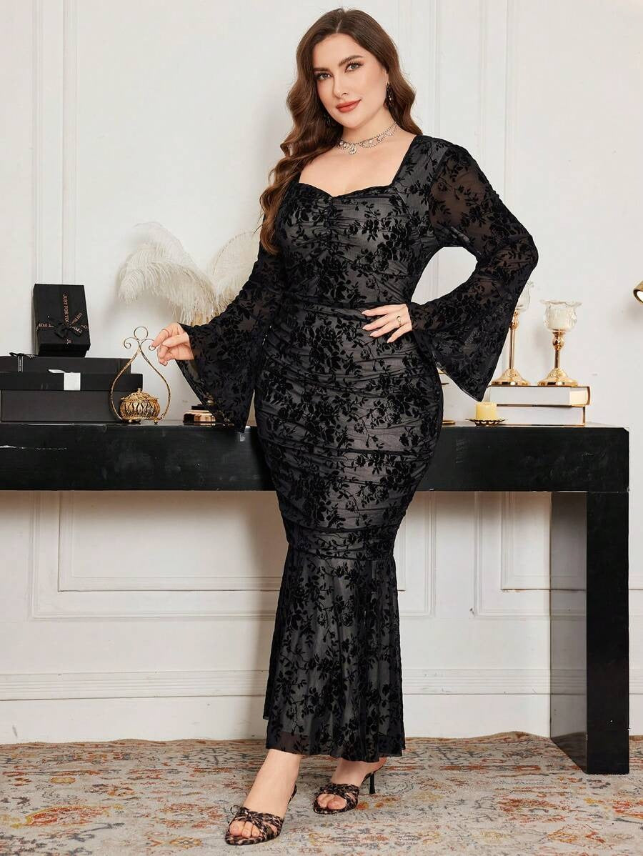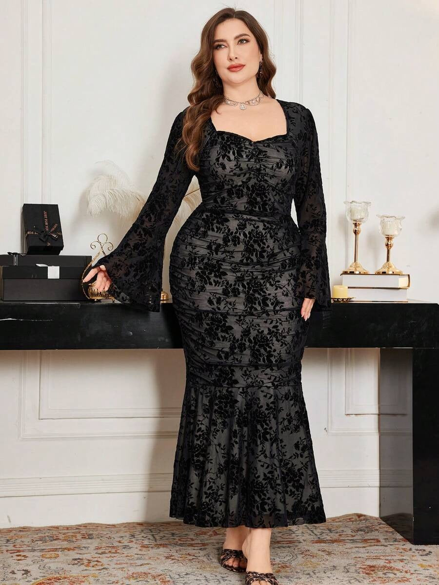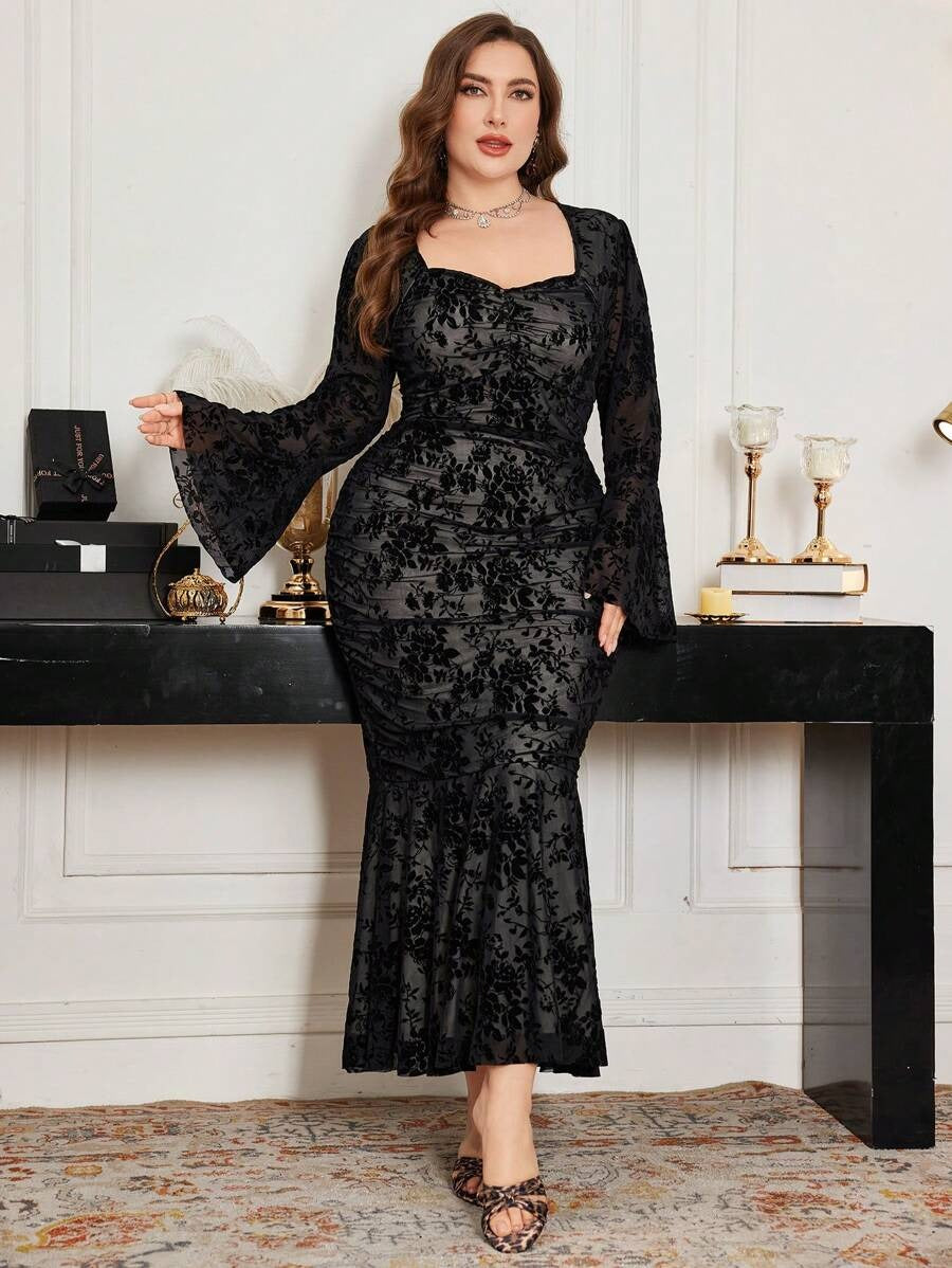 فستان دانتيل أسود ضيق بأكمام طويلة متسعة – مقاس كبير 🖤