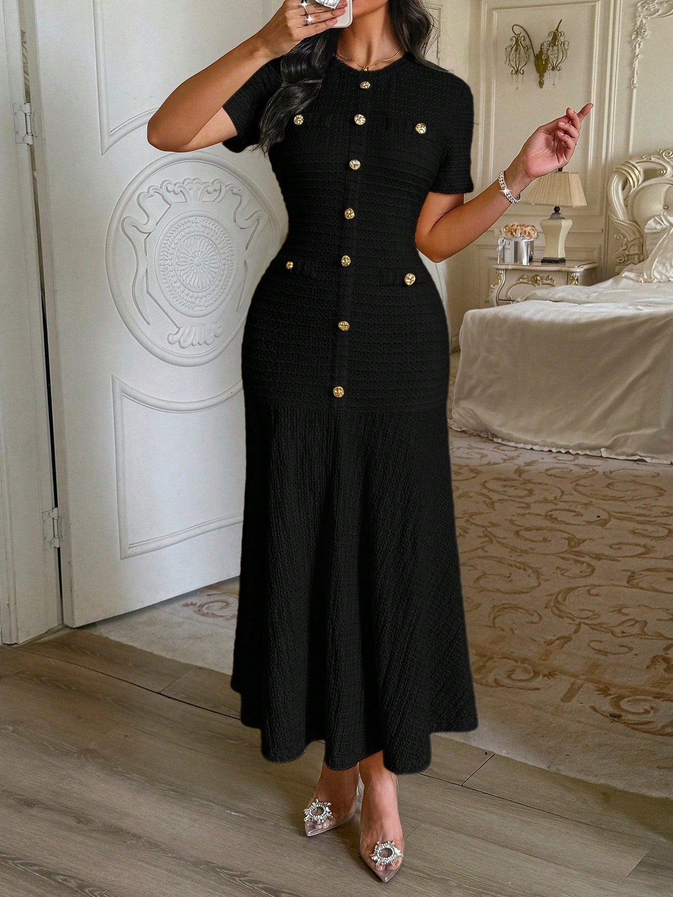 SHEIN فستان ربيعي بياقة مستديرة وأكمام قصيرة مزين بأزرار وجيوب