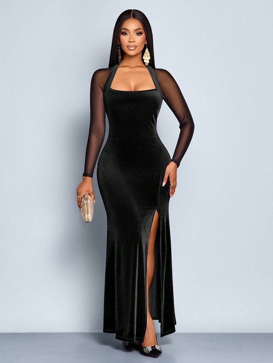SHEIN فستان سهرة أسود أنيق بقصة ضيقة من المخمل الفاخر