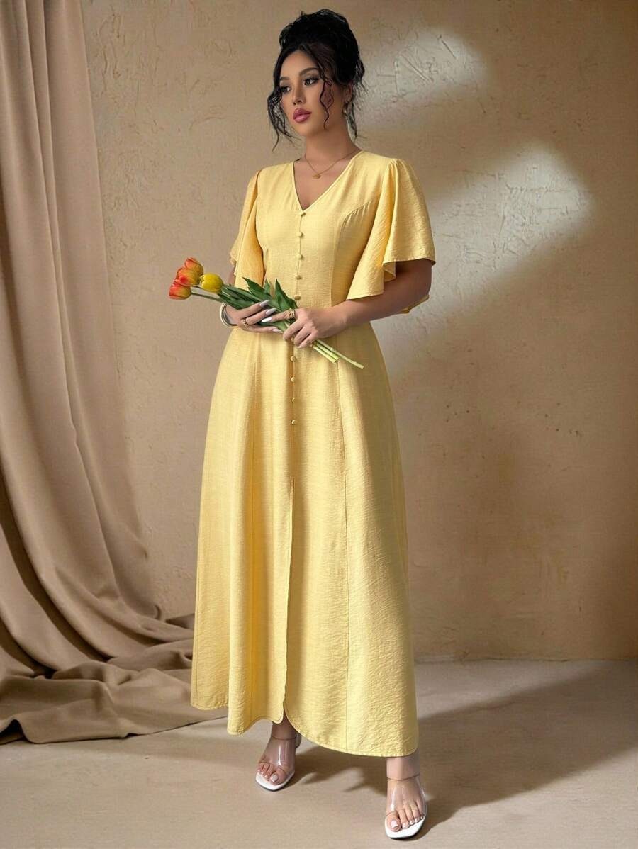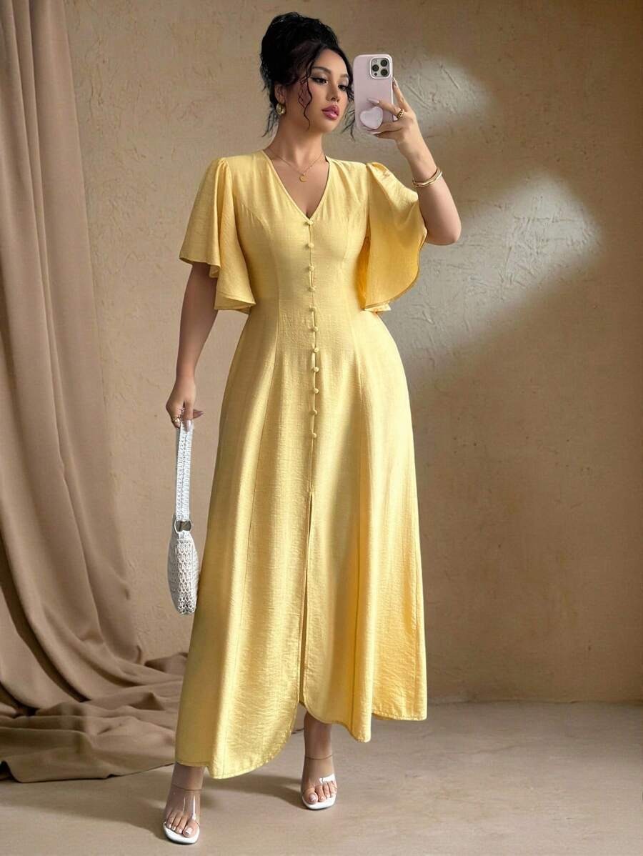 فستان أصفر بأزرار وفتحة جانبية – مقاس كبير 🍋
