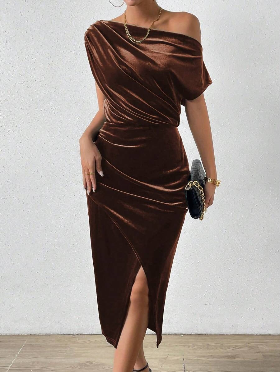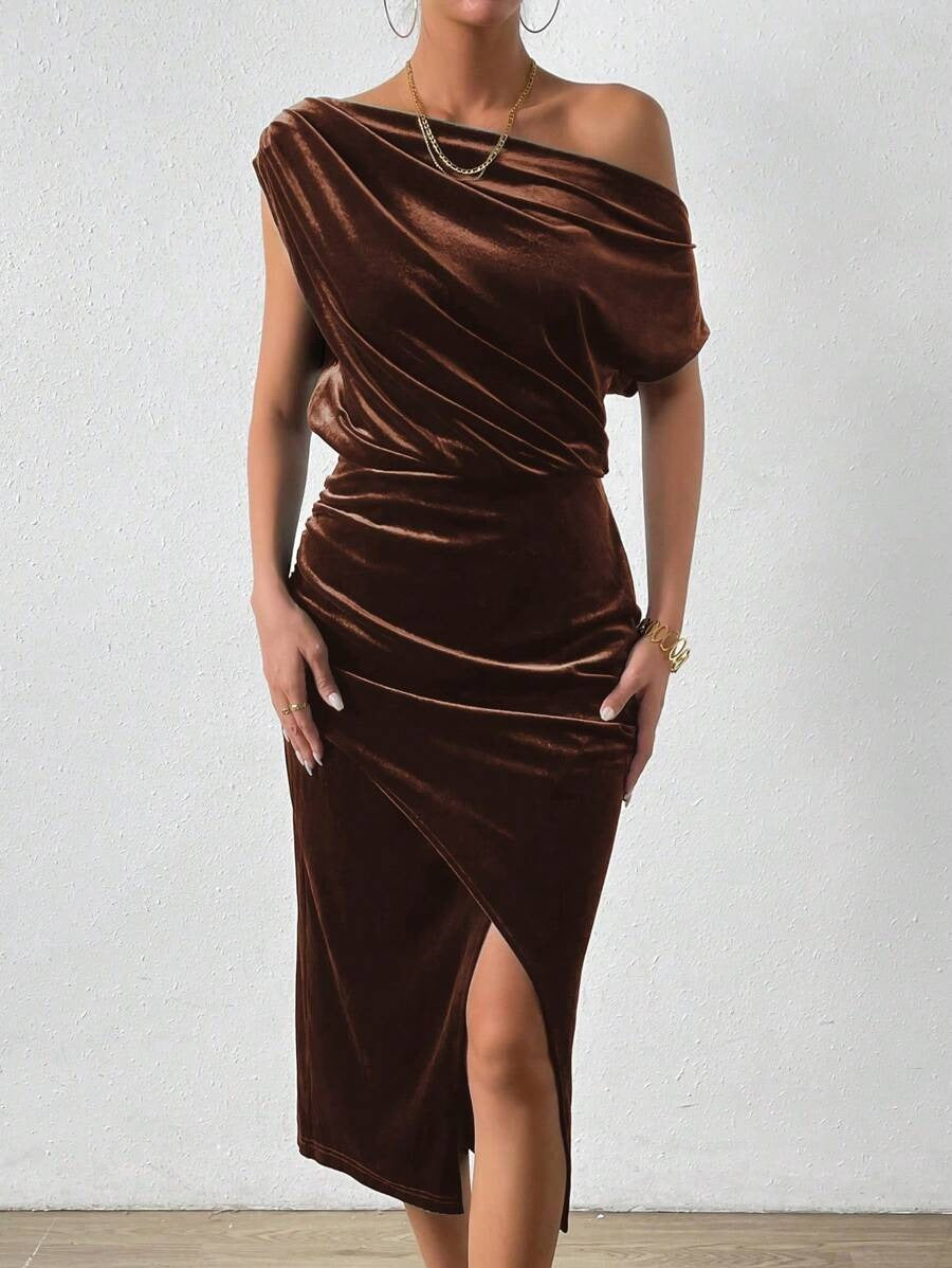 SHEIN فستان قطيفة ملكي بكتف واحد بلون بني