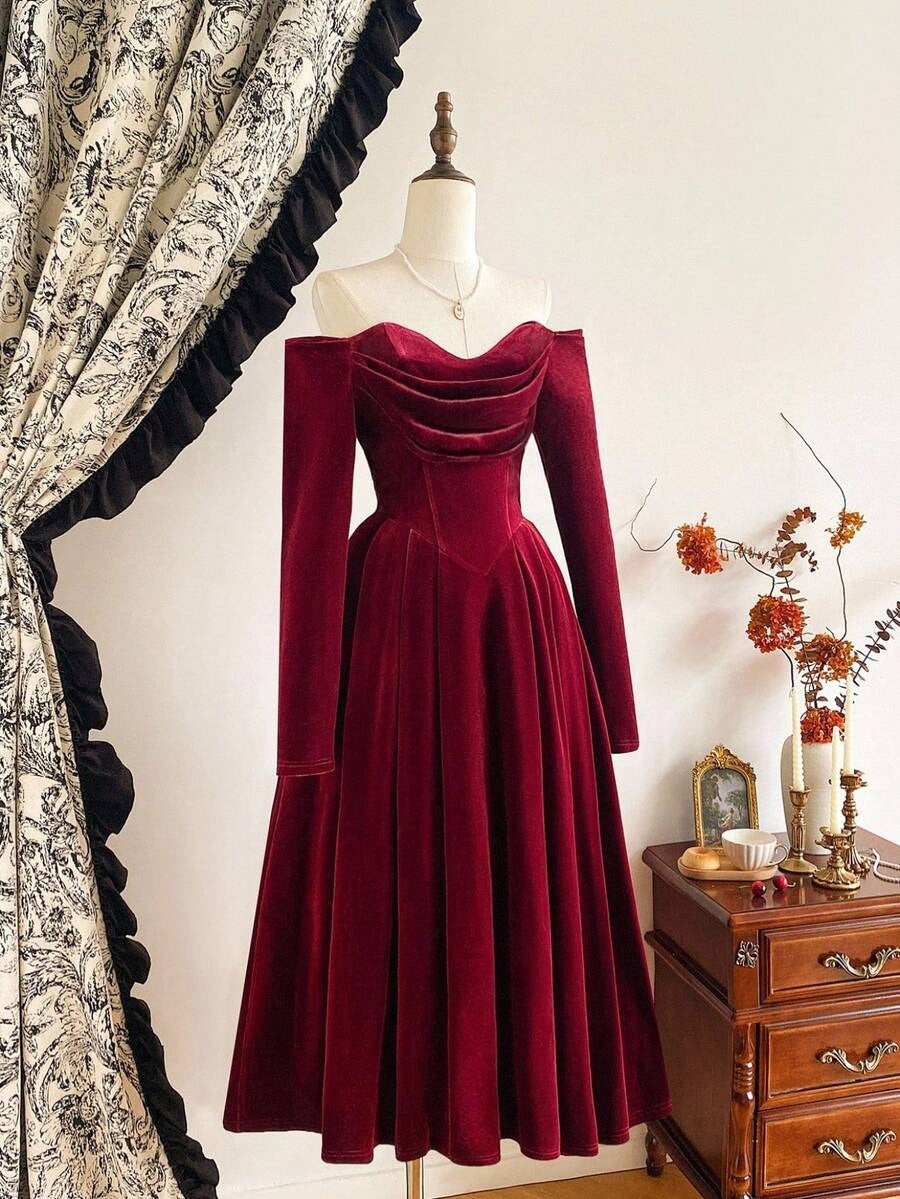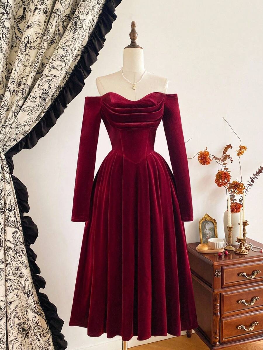 SHEIN فستان مخملي عنابي أنيق بجيوب وأكمام طويلة