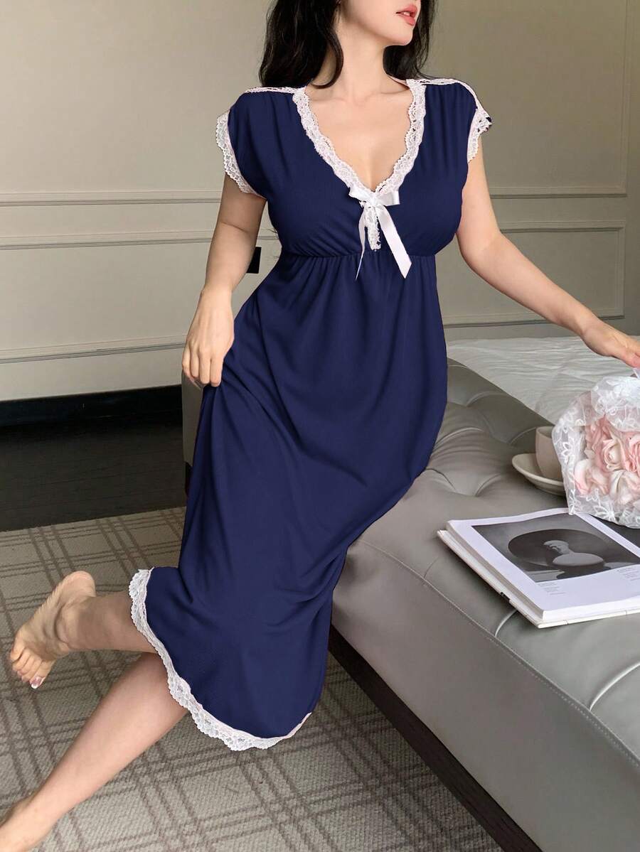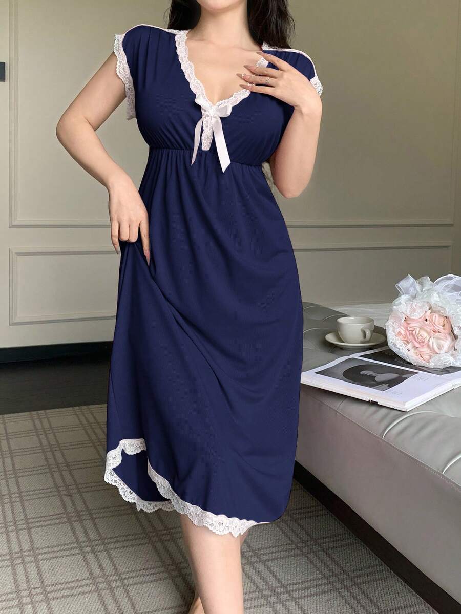 SHEIN فستان نوم بياقة عميقة وشريط دانتيل وعقدة بدون أكمام