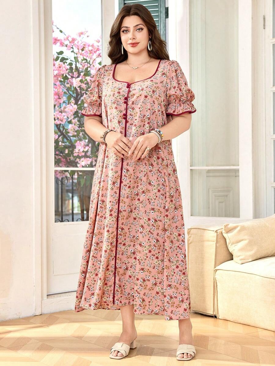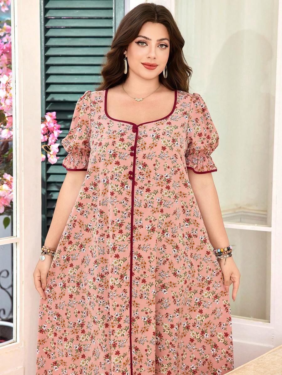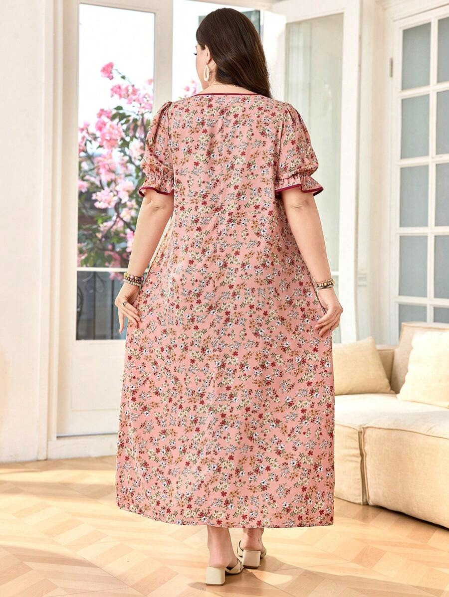 SHEIN فستان واسع بنقشة زهور برقبة مربعة وأكمام منتفخة