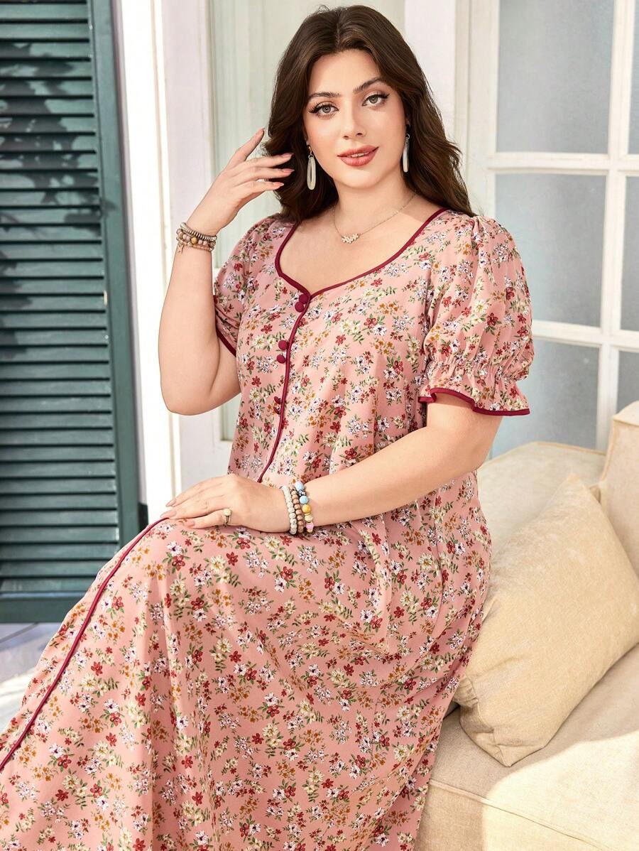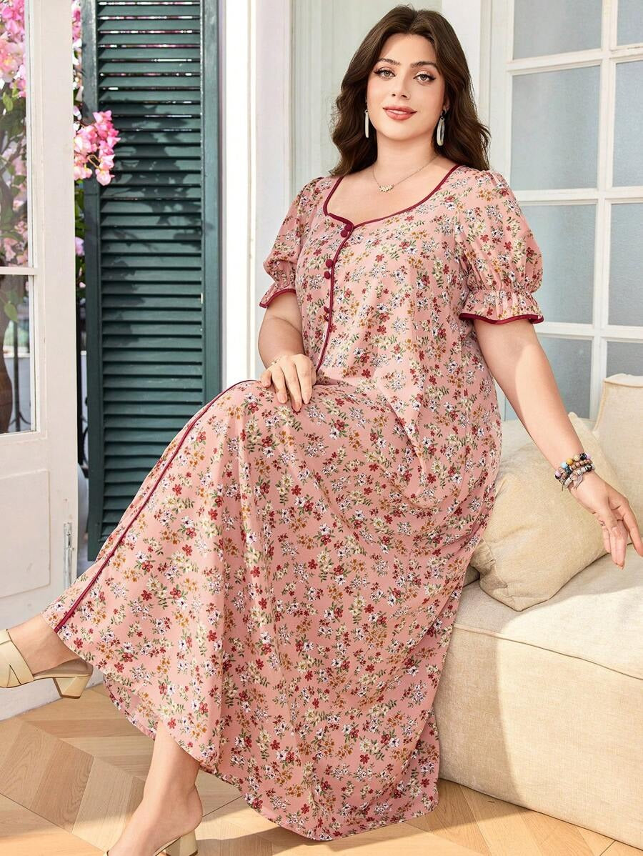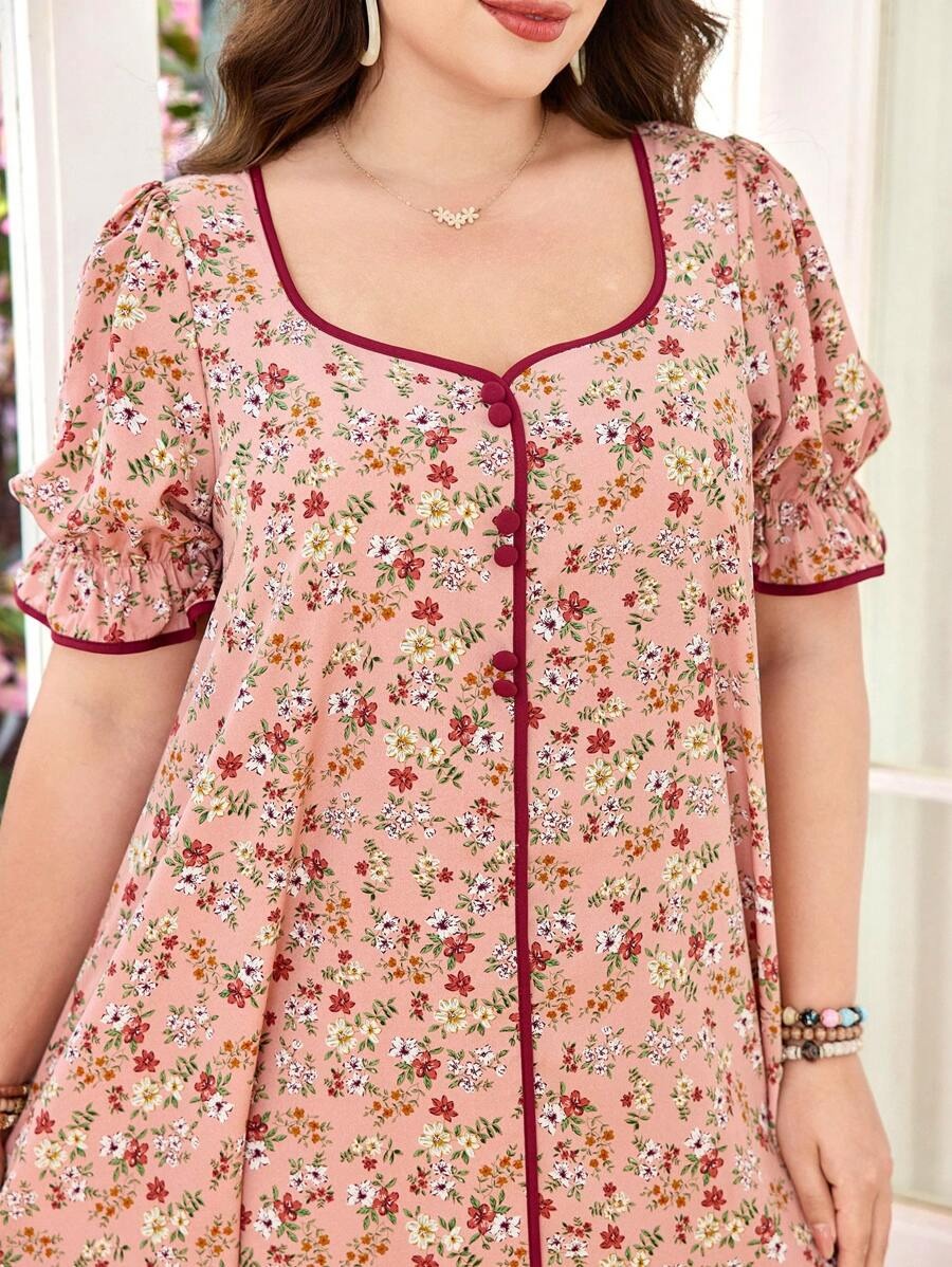 SHEIN فستان واسع بنقشة زهور برقبة مربعة وأكمام منتفخة