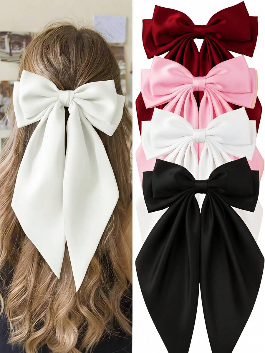 مجموعة أنيقة من مشابك الشعر الحريرية كبيرة الحجم بذيل طويل، بألوان سوداء، بيضاء، وردية وحمراء. مثالية للاستخدام اليومي، حفلات الزفاف، شهر رمضان، عيد الحب، أو لإضفاء لمسة كاجوال جذابة وعصرية لإطلالتك.
