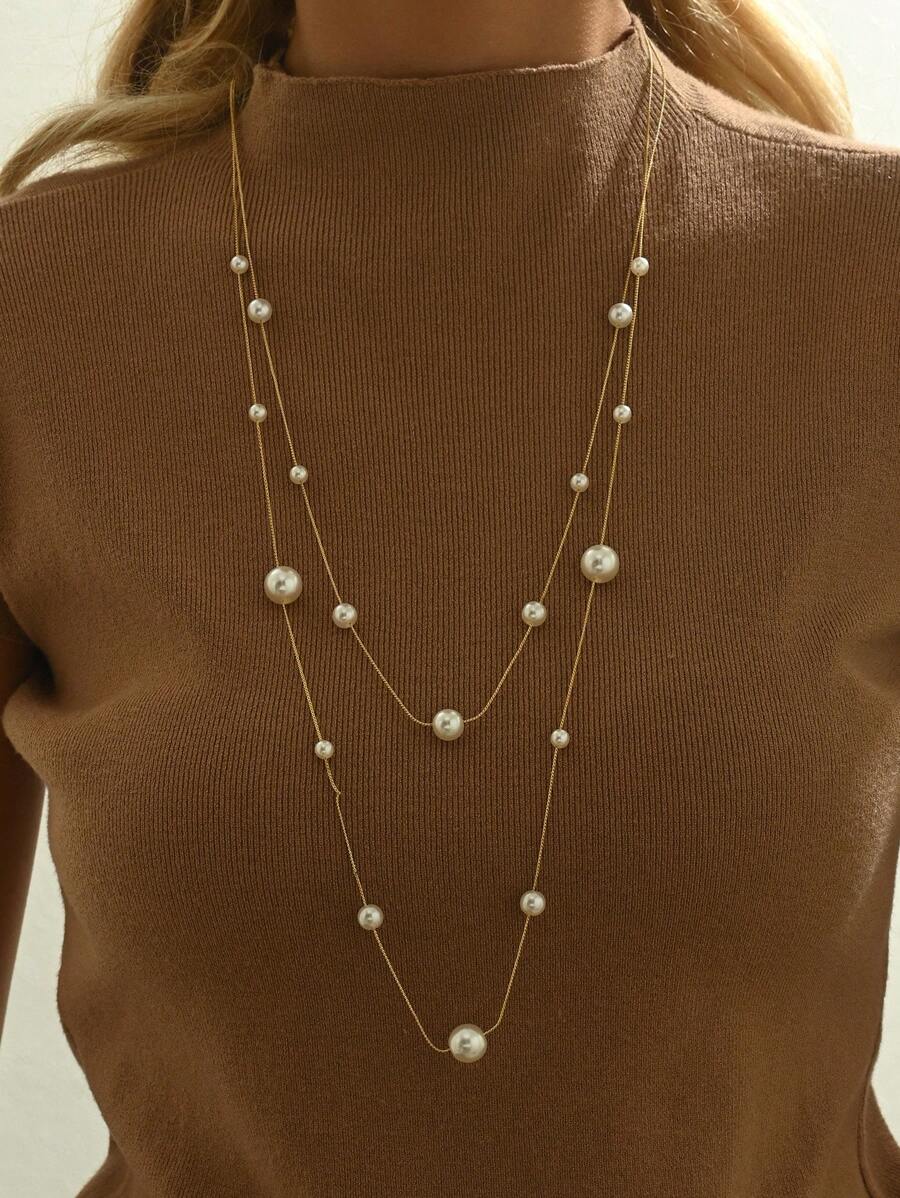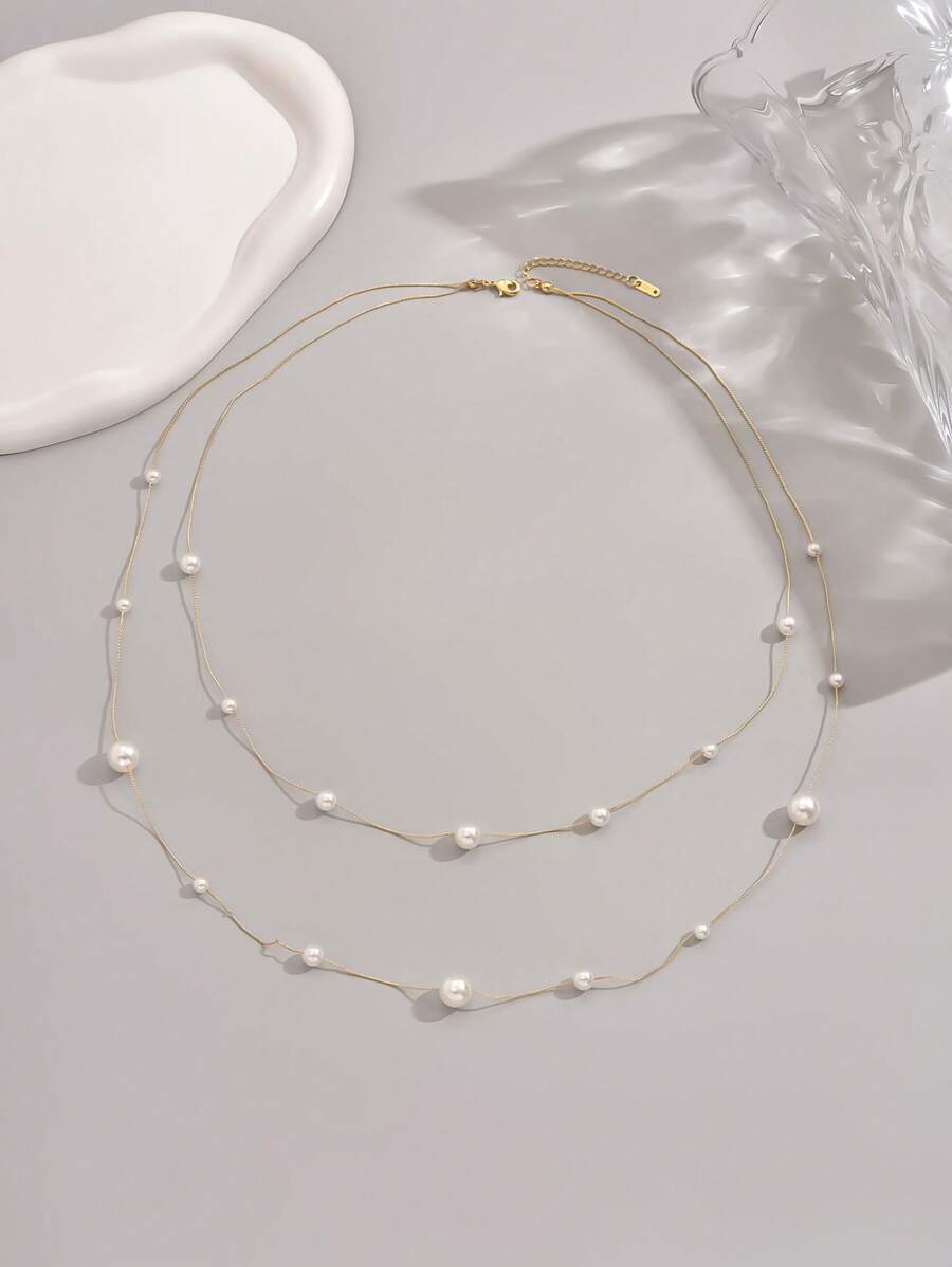 SHEIN قلادة مزدوجة مطلية ذهبية عيار 18 مع لؤلؤ