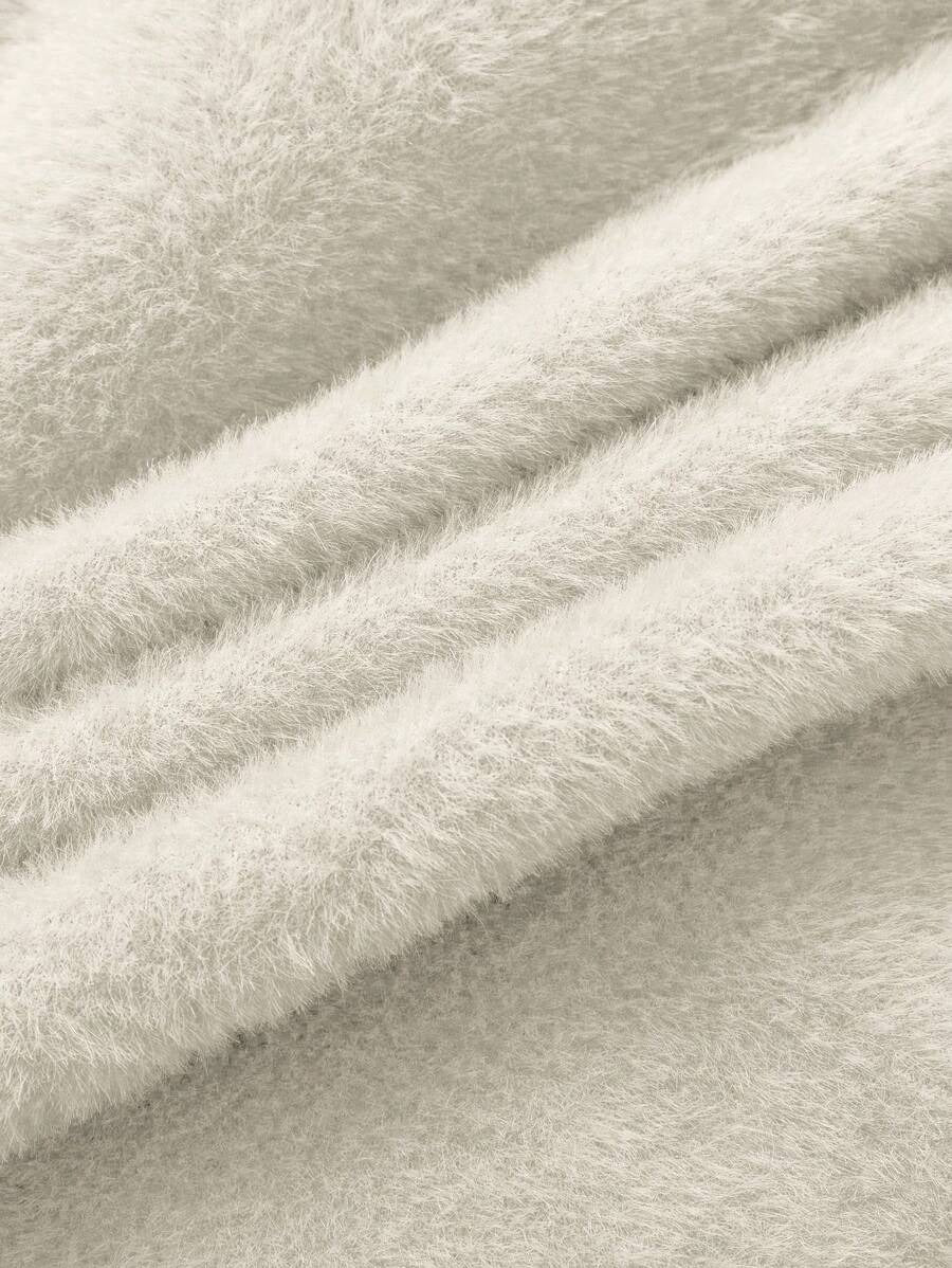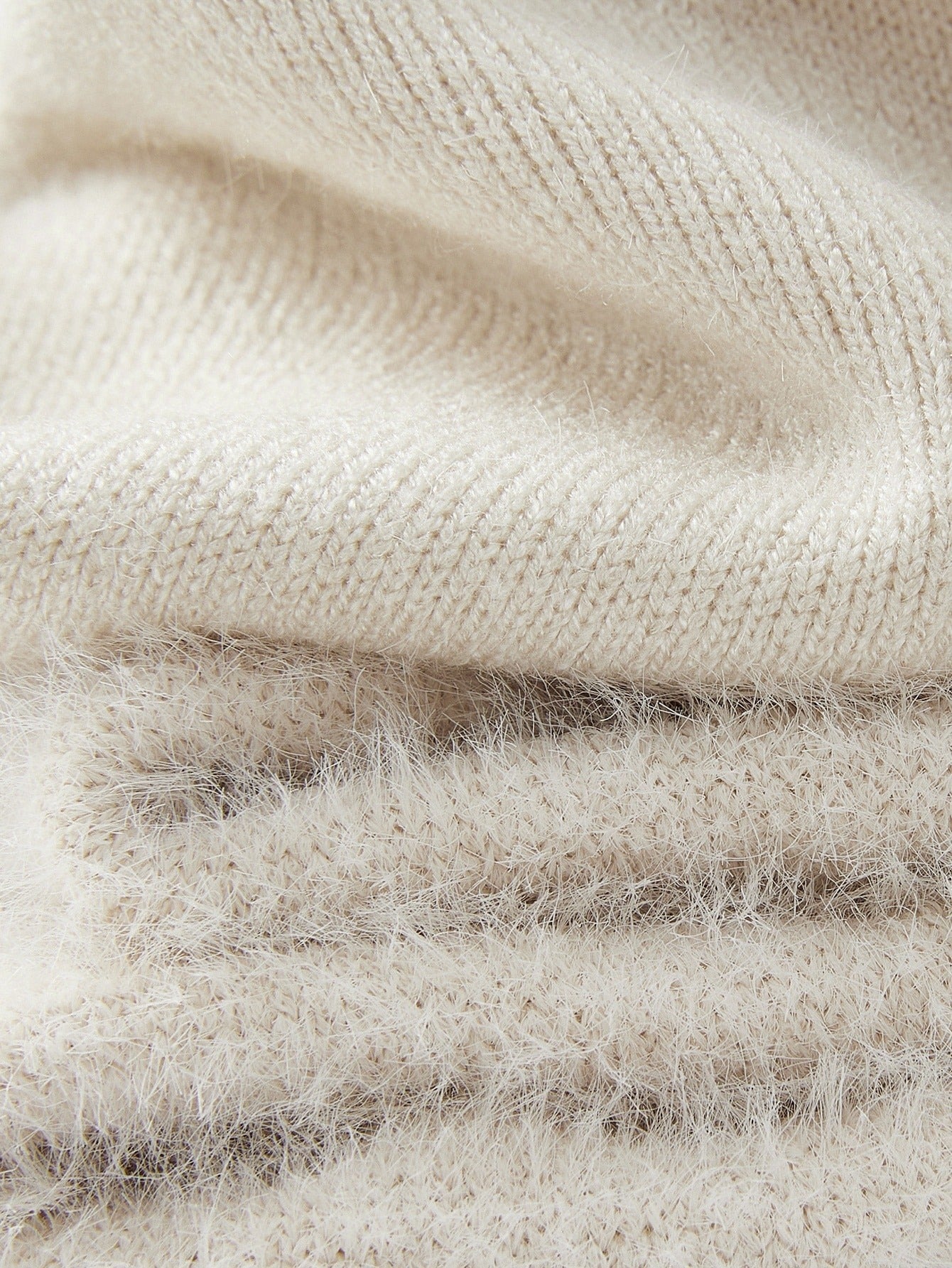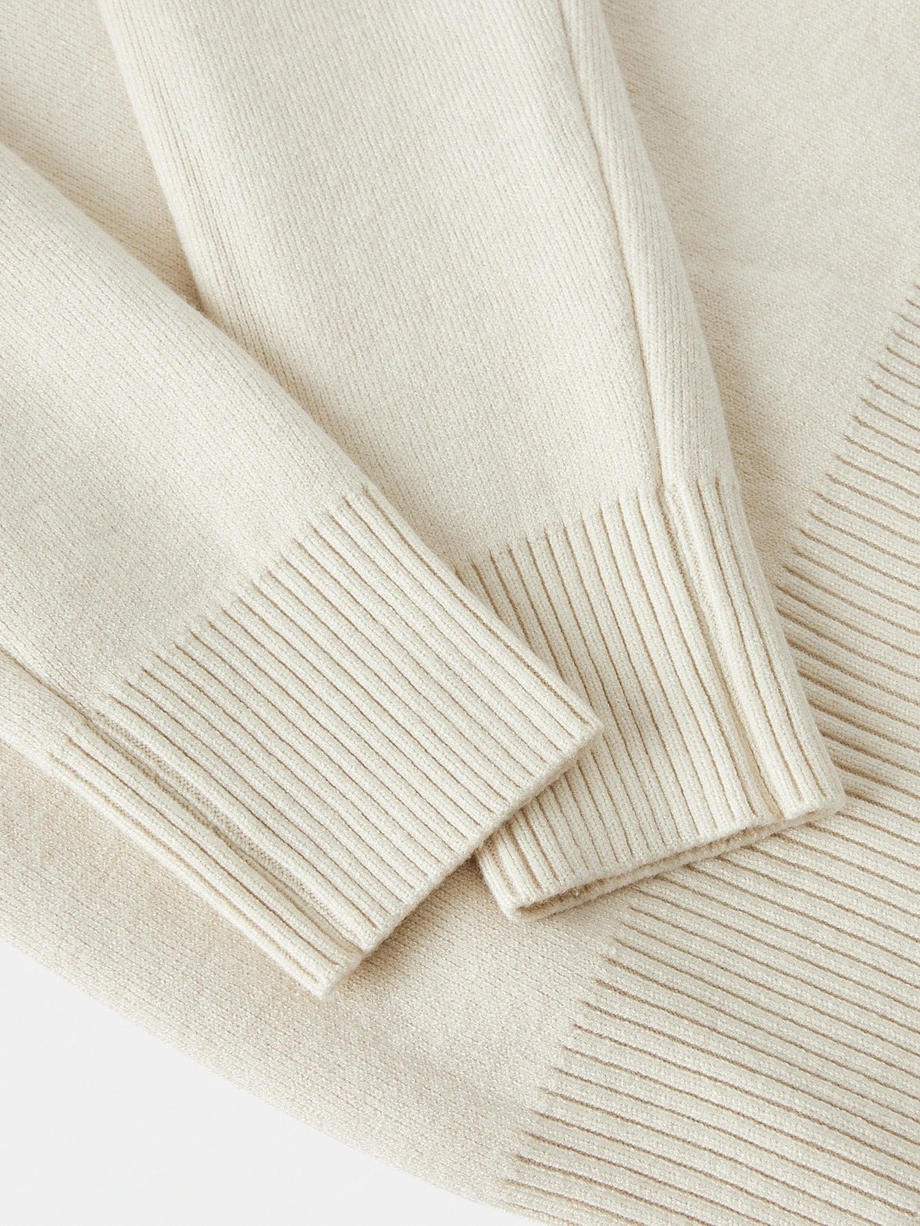 كنزة صوفية بلون بيج ، تصميم ضيق مبطن حراريًا للدفا في البرد، بياقة عالية وأكمام طويلة عادية. القماش ناعم ومرن شوي، مثالية كقطعة داخلية أو لحالها في أيام الشتاء الباردة.