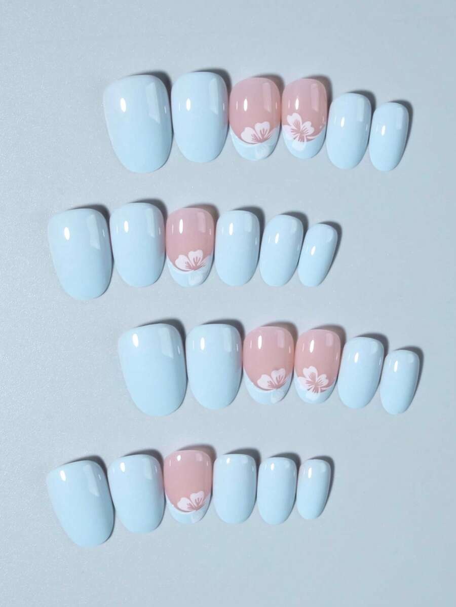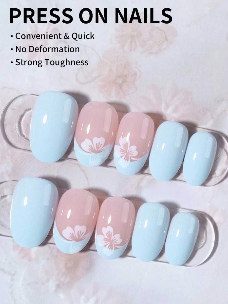 SHEIN مجموعة أظافر بيضاوية قصيرة – 24 قطعة مزينة بزهور