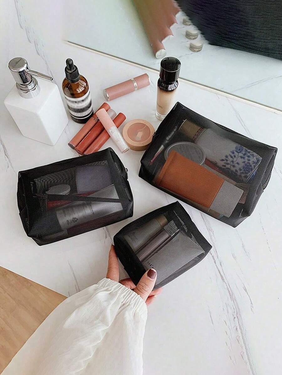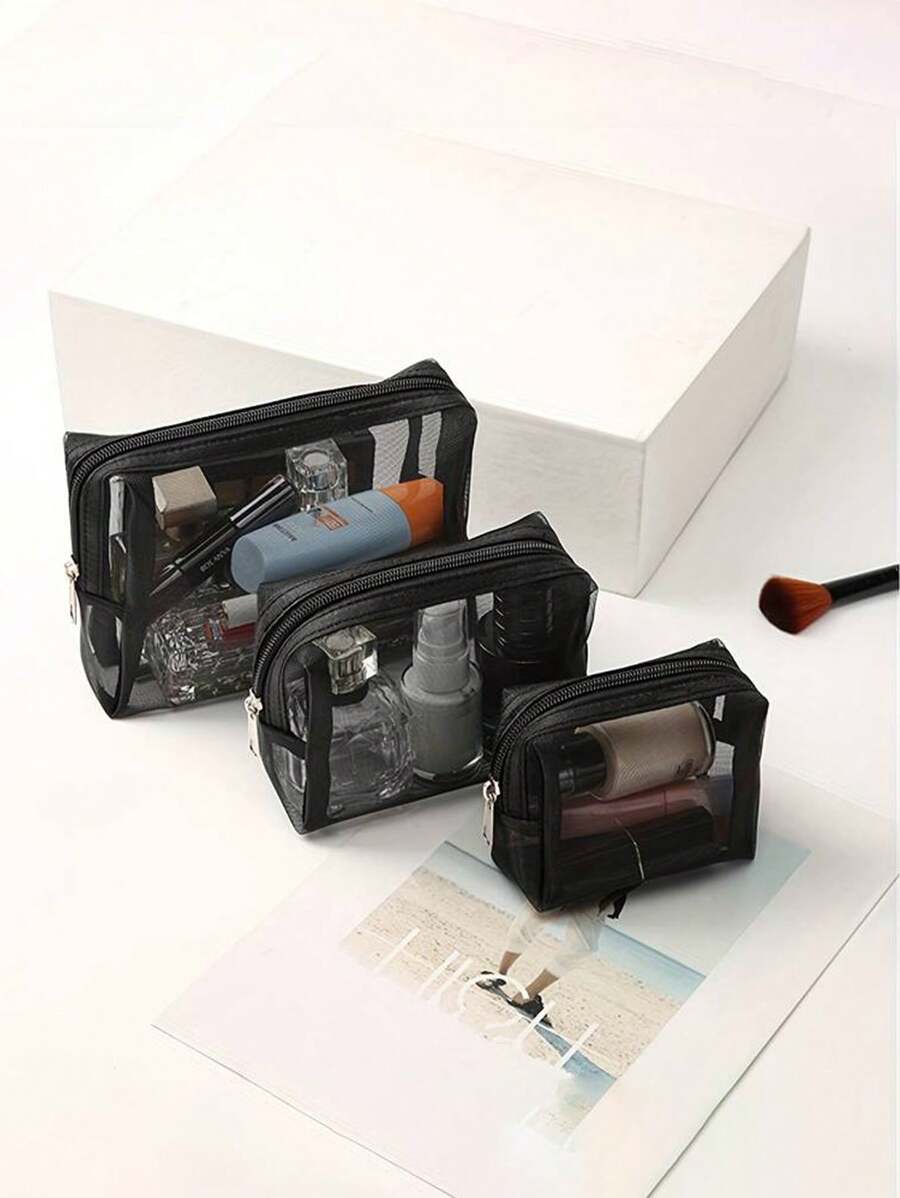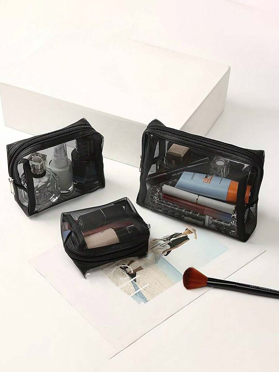 SHEIN مجموعة حقائب مكياج شفافة من الشبك بسحاب