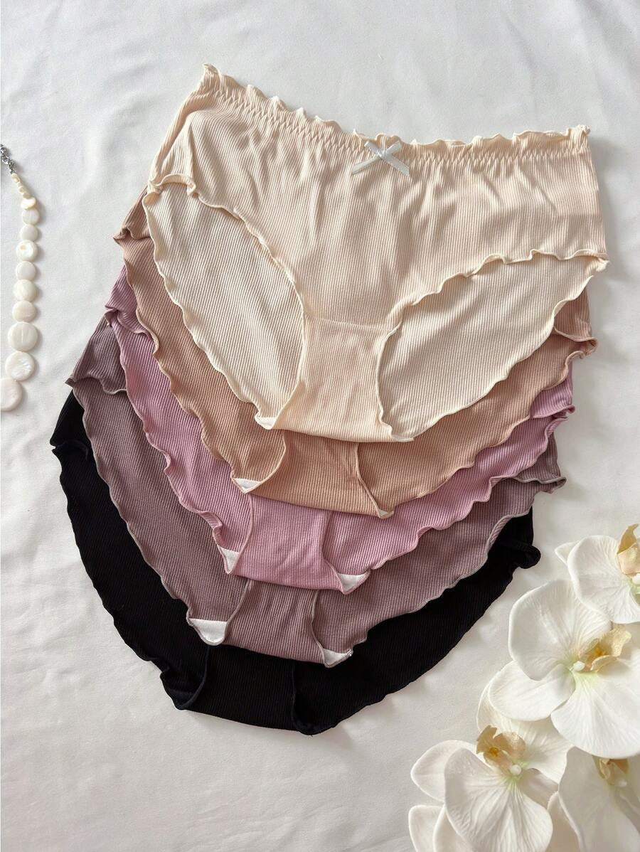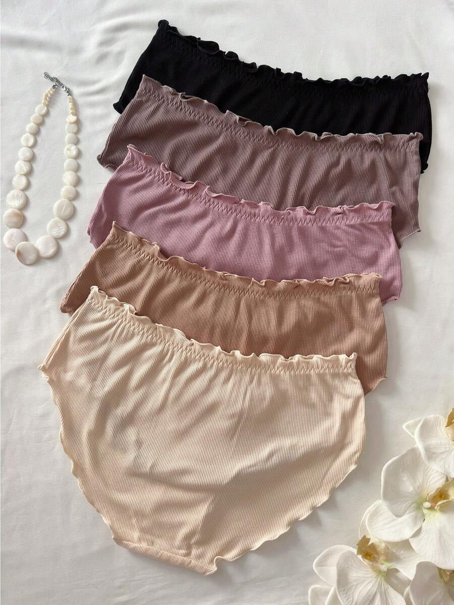 مجموعة من خمس قطع سروال داخلي نسائي بلون سادة وتصميم بسيط، مريحة ومناسبة للاستخدام اليومي، مصنوعة من أقمشة محبوكة مرنة.