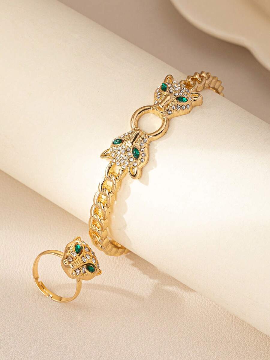 SHEIN مجموعة سوار وخاتم ذهبي برأس فهد مفتوح