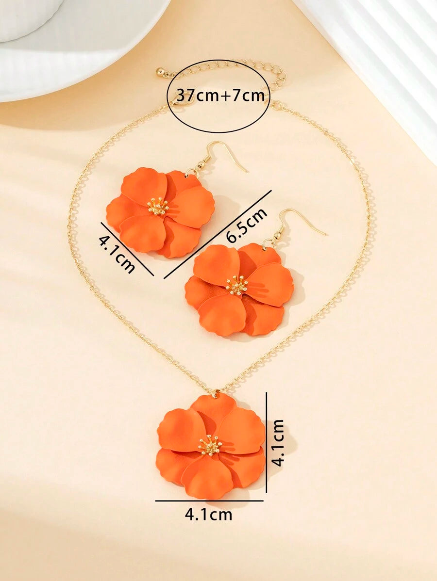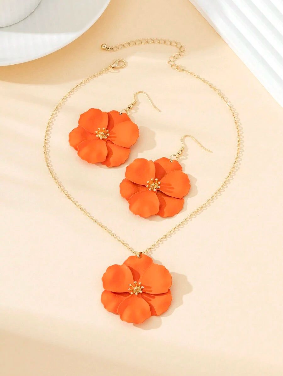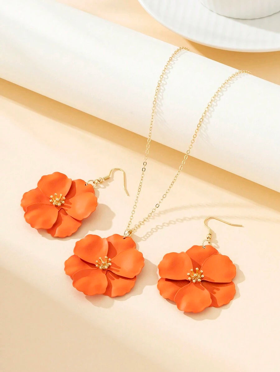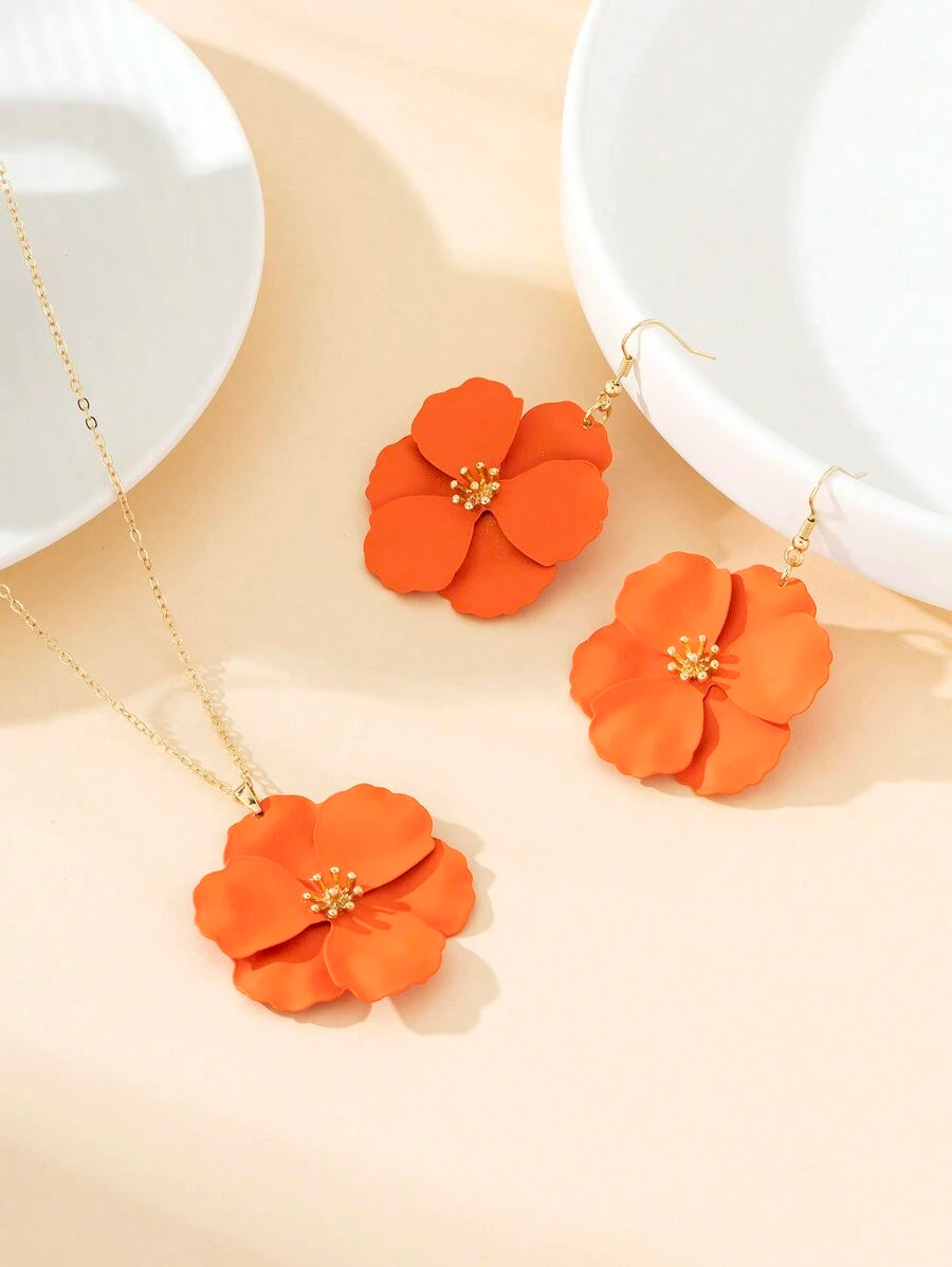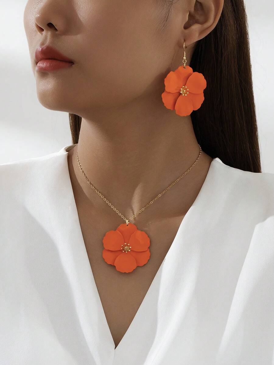 SHEIN مجموعة قلادة وأقراط زهرة معدنية برتقالية