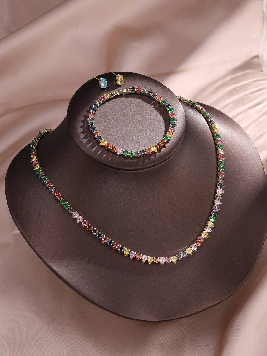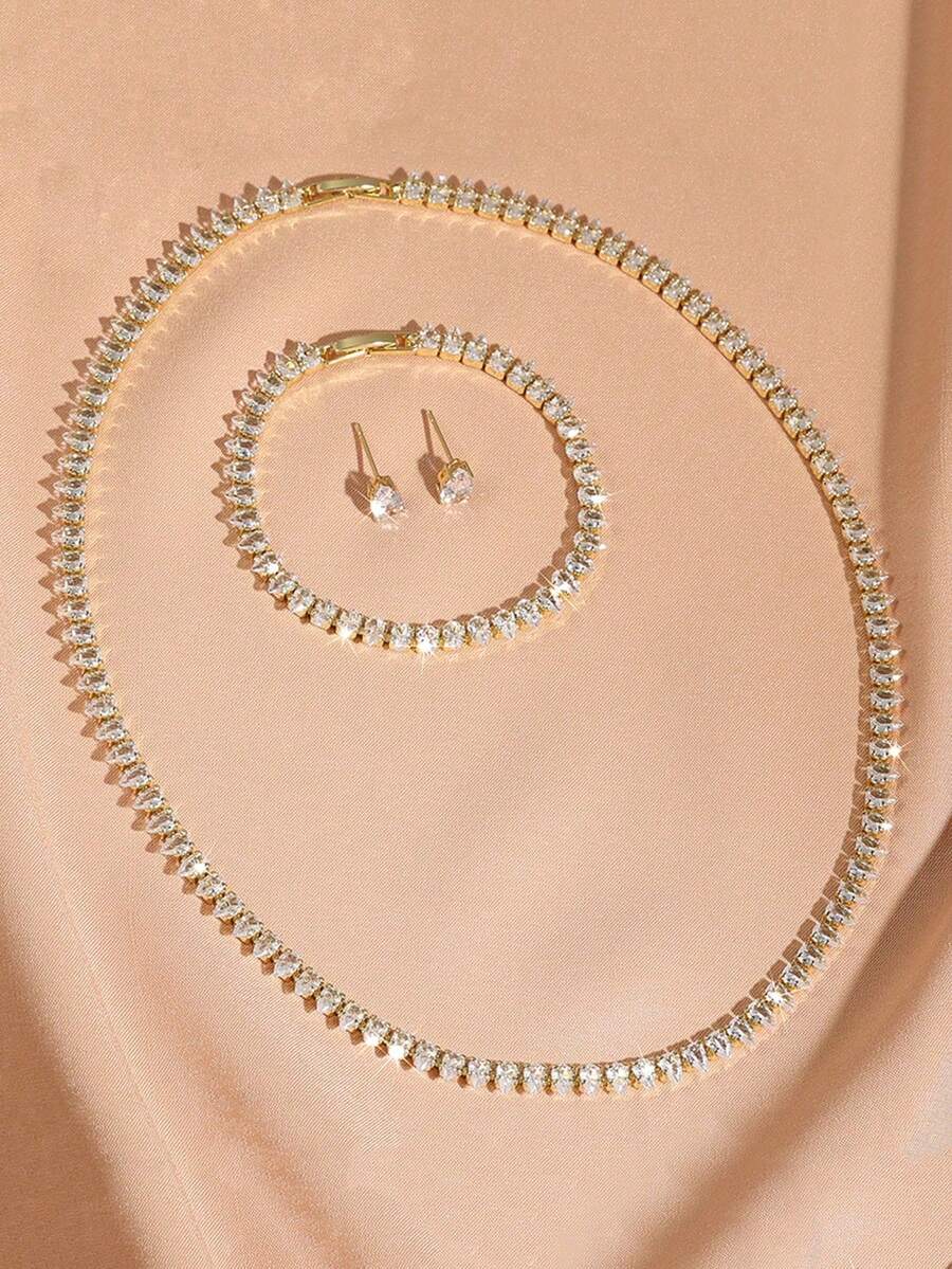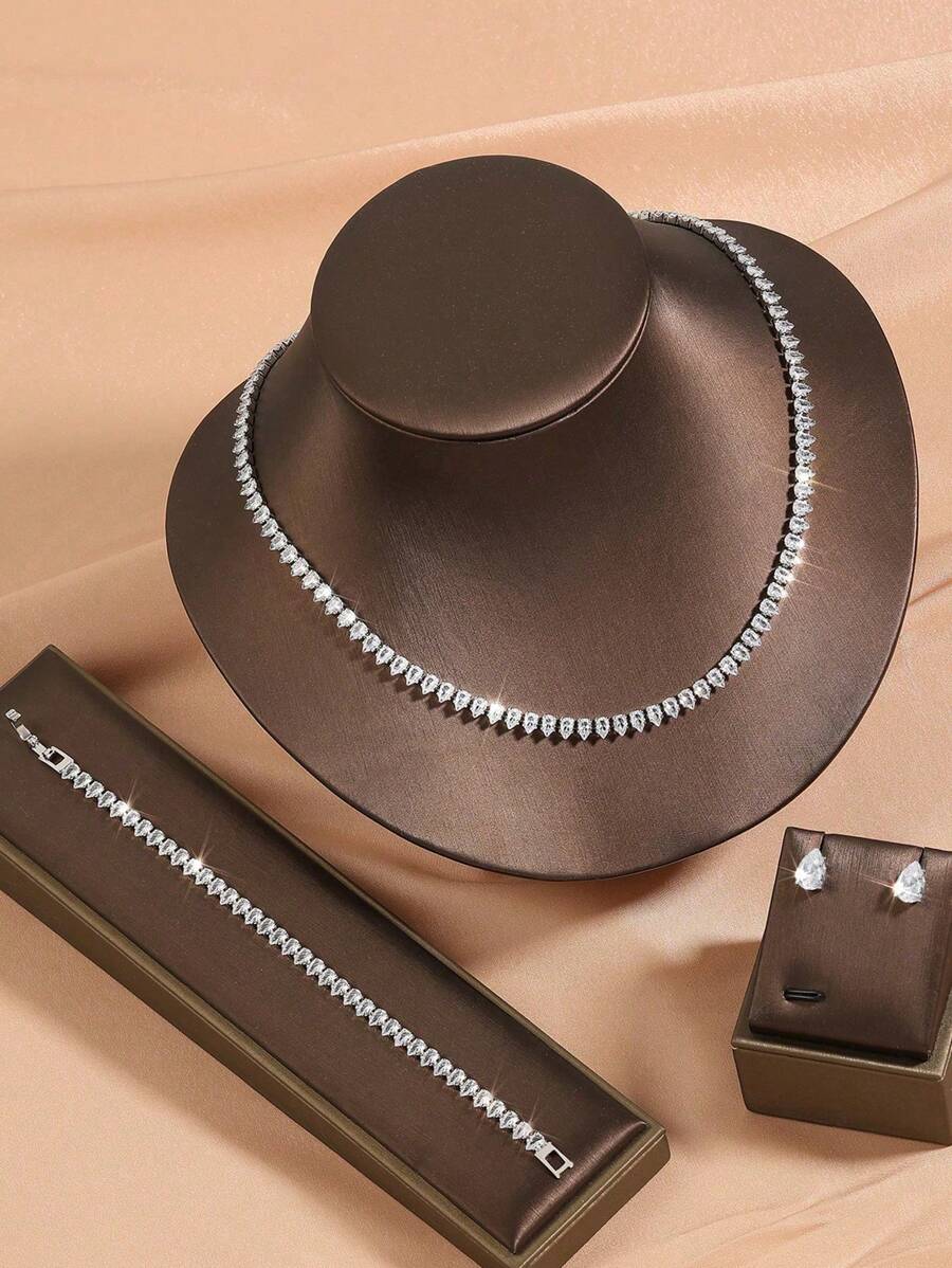 مجموعة أنيقة تشمل قلادة، سوار وأقراط مزينة بأحجار المكعبة على شكل قطرة ماء، مثالية لديكورات حفلات الزفاف للنساء.المواصفات:
