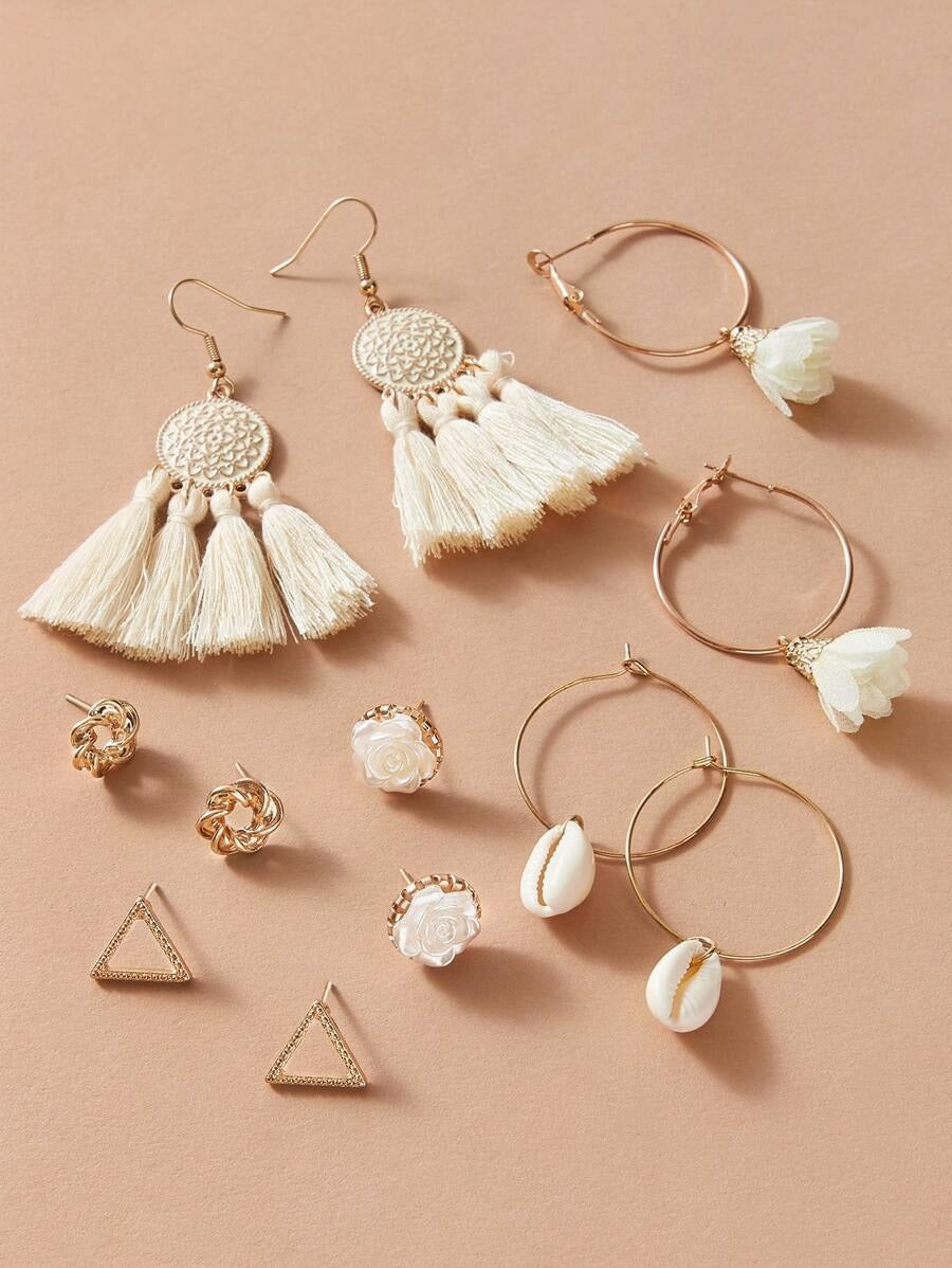 SHEIN مجموعة من 6 أزواج أقراط بتصميم بوهيمي مزينة بزهور وصدف
