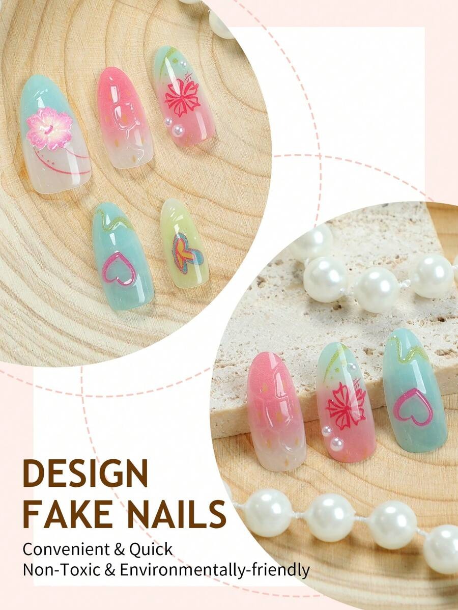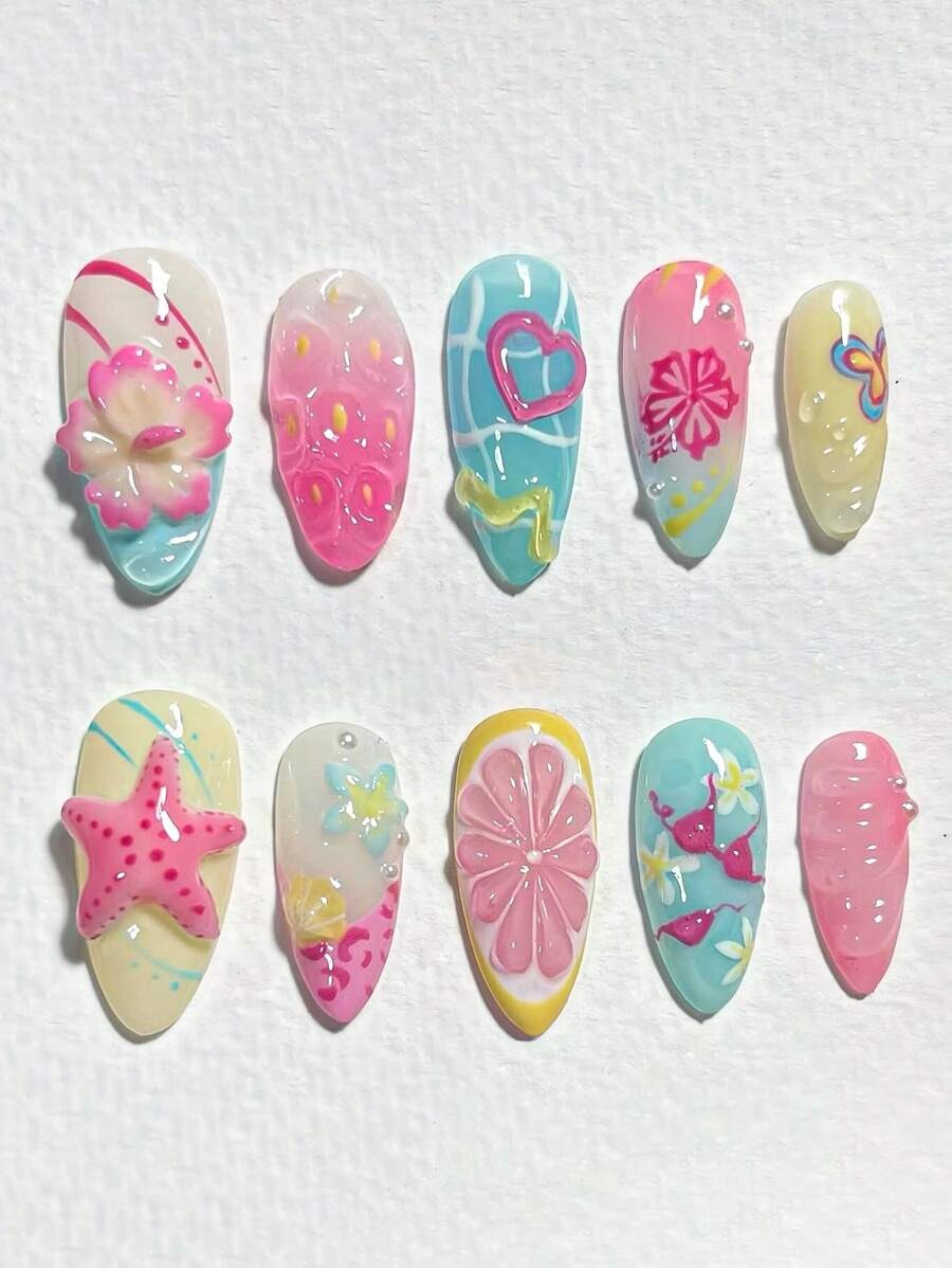 طقم أظافر زائفة ثلاثية الأبعاد مميز فيه 10 قطع بشكل لوزي، بتدرج لوني جذاب ولمعة خفيفة. فيه نقشات فلور وليمون وراينستون تضيف لمسة صيفية ناعمة. تغطية كاملة وسهلة التركيب، مثالية للبنات اللي يحبوا ستايل Y2K أو اللمسة الفرنسية 💅