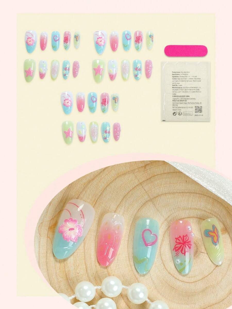 SHEIN طقم أظافر لوزية متوسطة بتصميم فلور وليمون – 10 قطع
