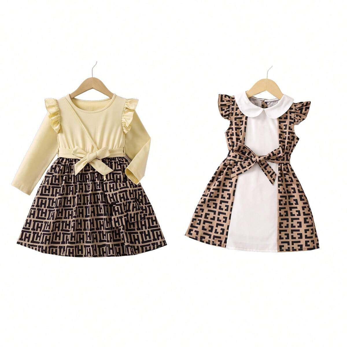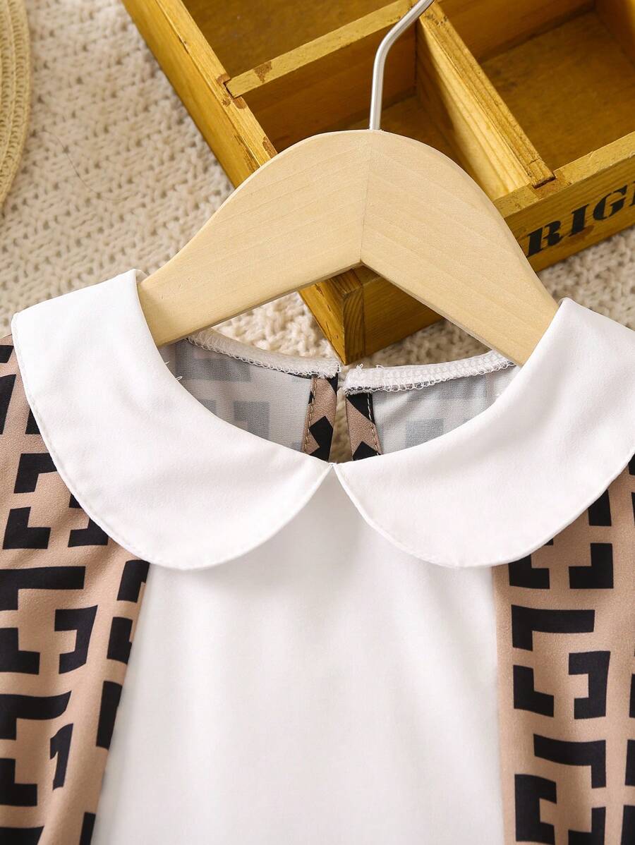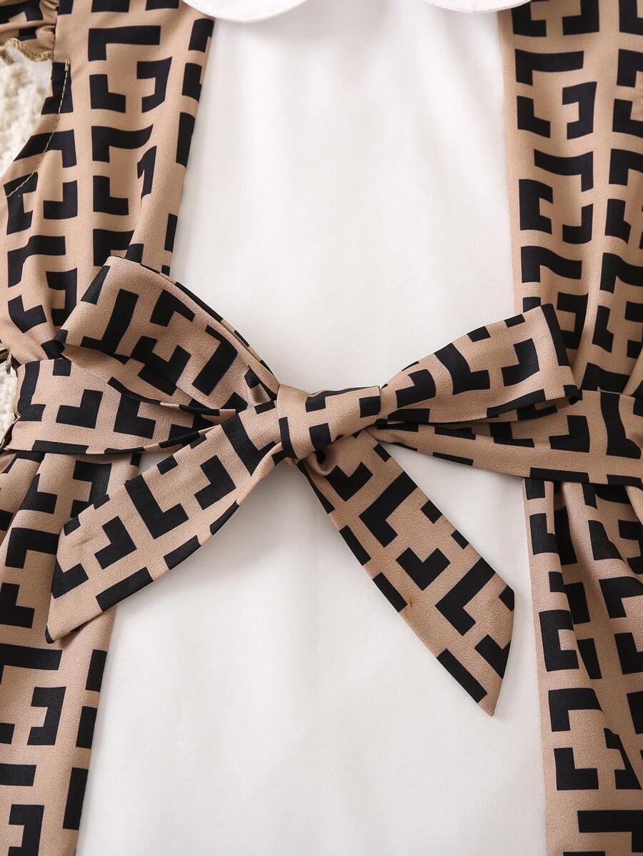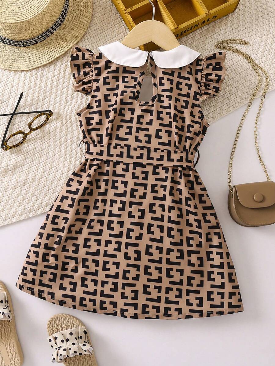 SHEIN فستان مطبوع بأشكال مع حواف مزينة بالريش وياقة بيتر بان مزموجة وحزام للفتاة الصغيرة