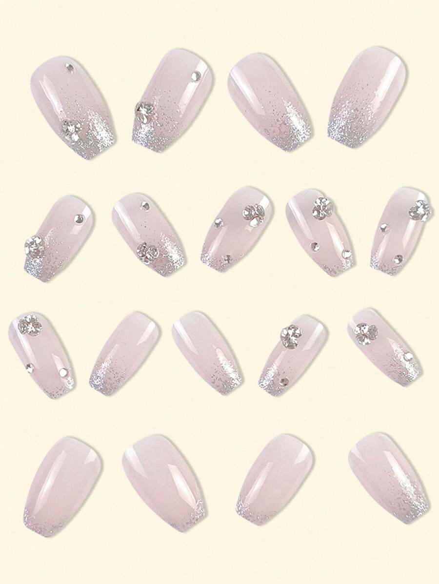 ارتقِ بأناقتك مع طقم أظافر وردي فاتح، شكله تابوت ومتوسط إلى طويل، وفيه تدرج ألوان ولمعة فخمة مزينة بأحجار 💅