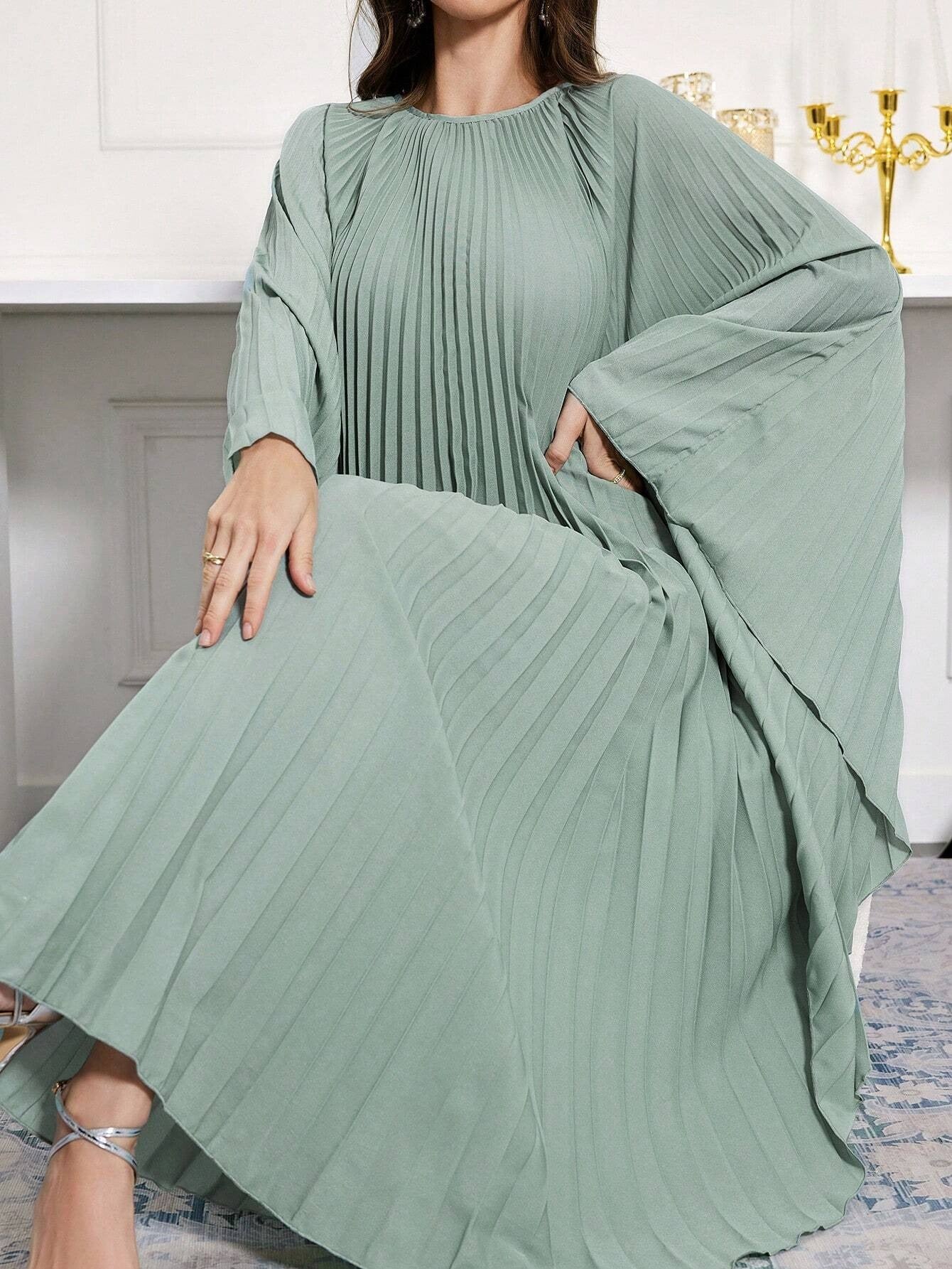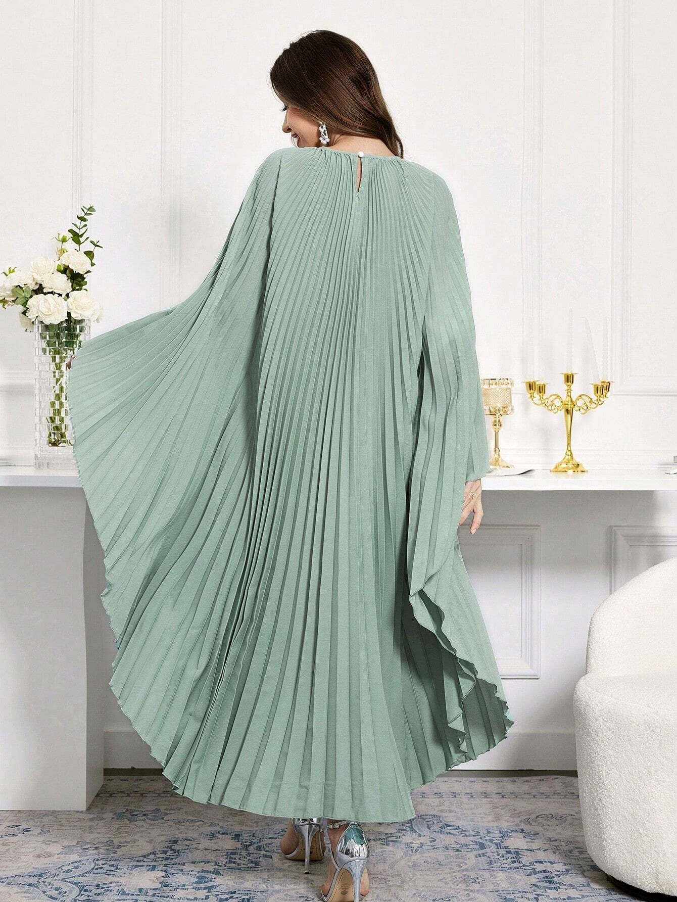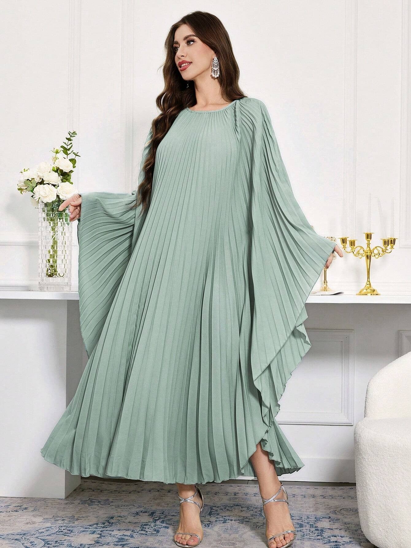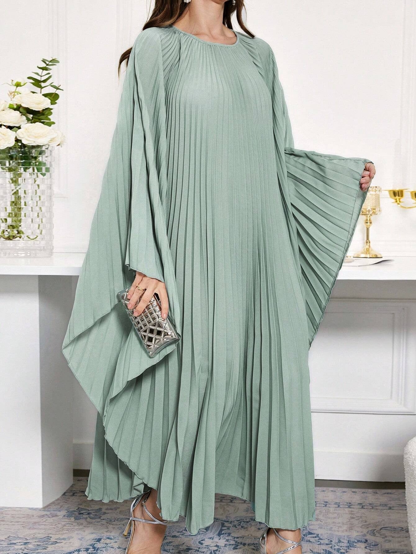 SHEIN Al Najma فستان قفطان عربي محتشم طويل الأكمام برقبة مستديرة موحد اللون