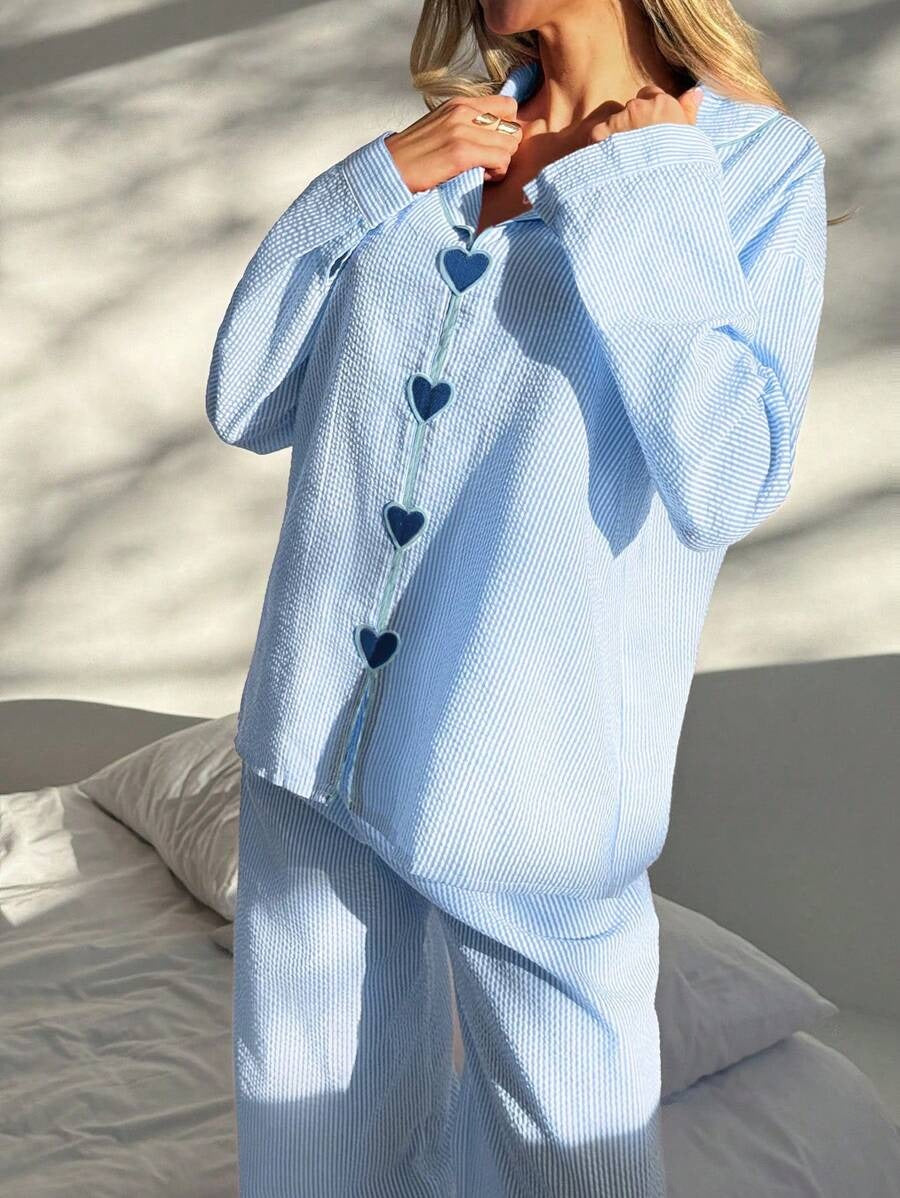 طقم ناعم وأنيق مكوّن من بلوزة بأكمام طويلة وبنطال طويل، بقصة مريحة وبستايل كاجوال. التصميم فيه لمسة أنثوية بنقوش قلوب وخطوط، وياقة عنق غربية تعطي شكل عصري. اللون الأزرق الفاتح يضيف طلة هادية ومنتعشة.