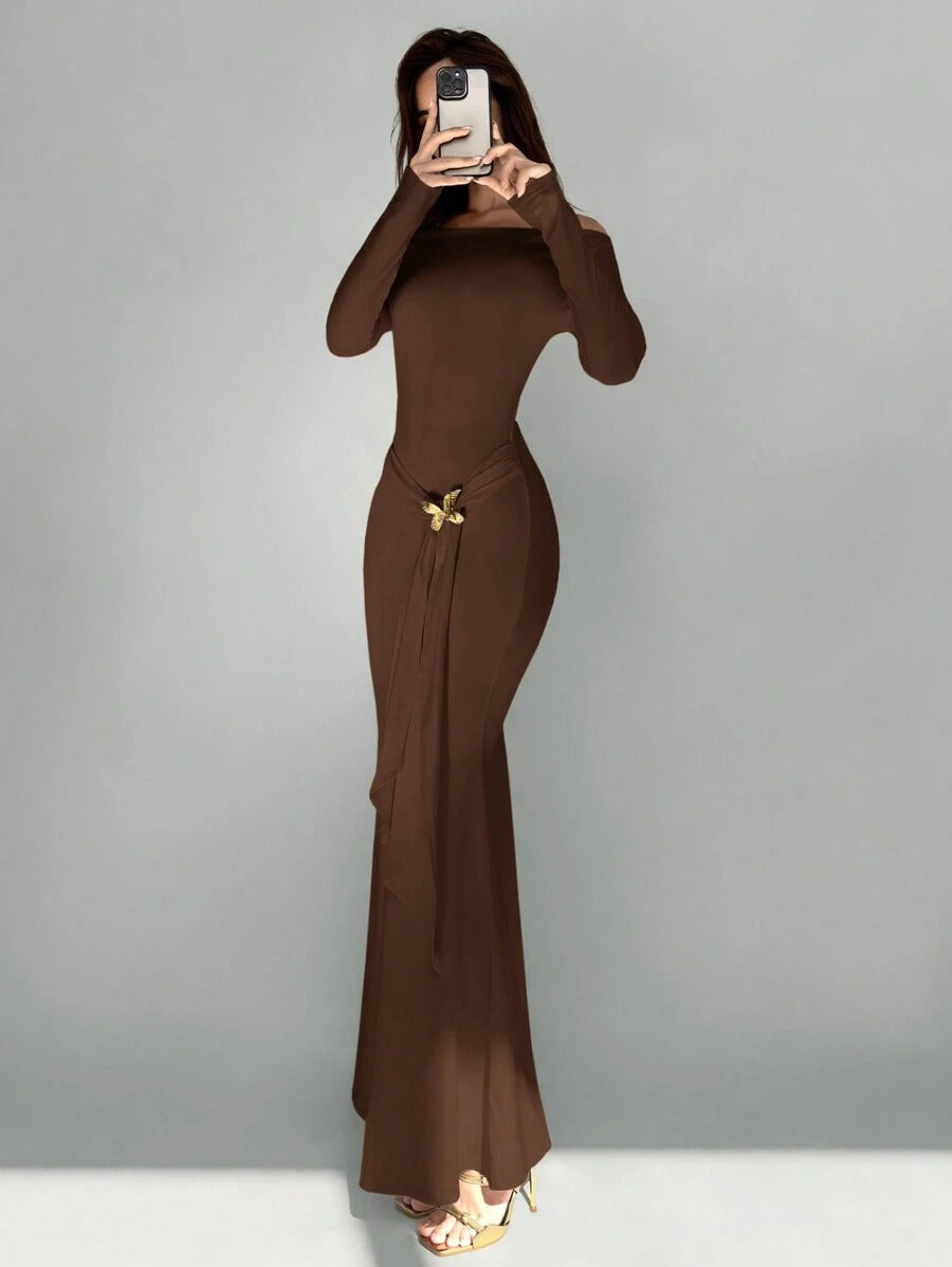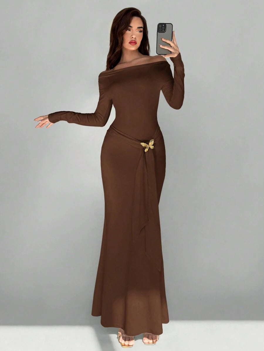 👗🤎 فستان طويل للنساء مع زخرفة فيونكة معدنية للكتف المنكشف
