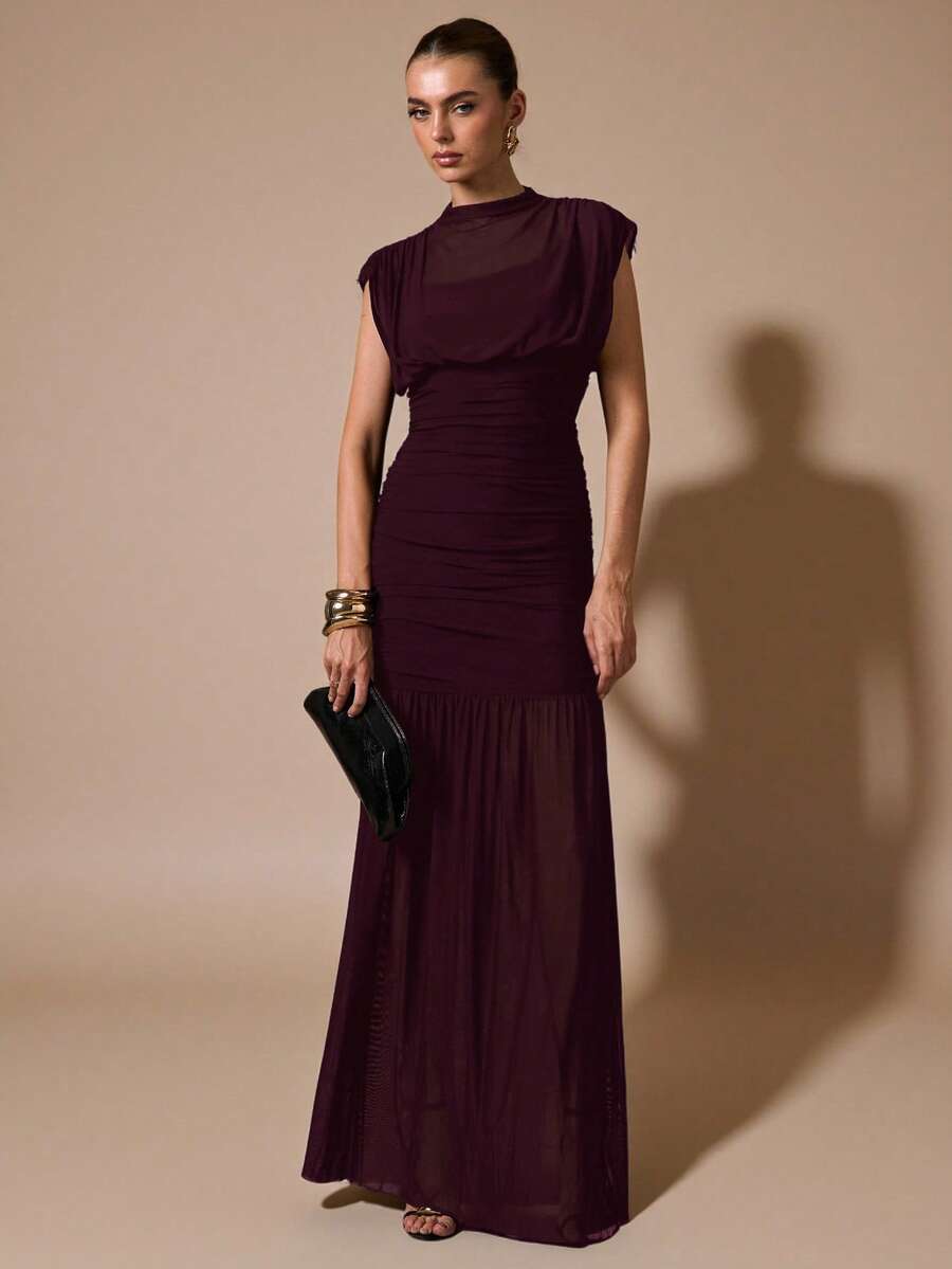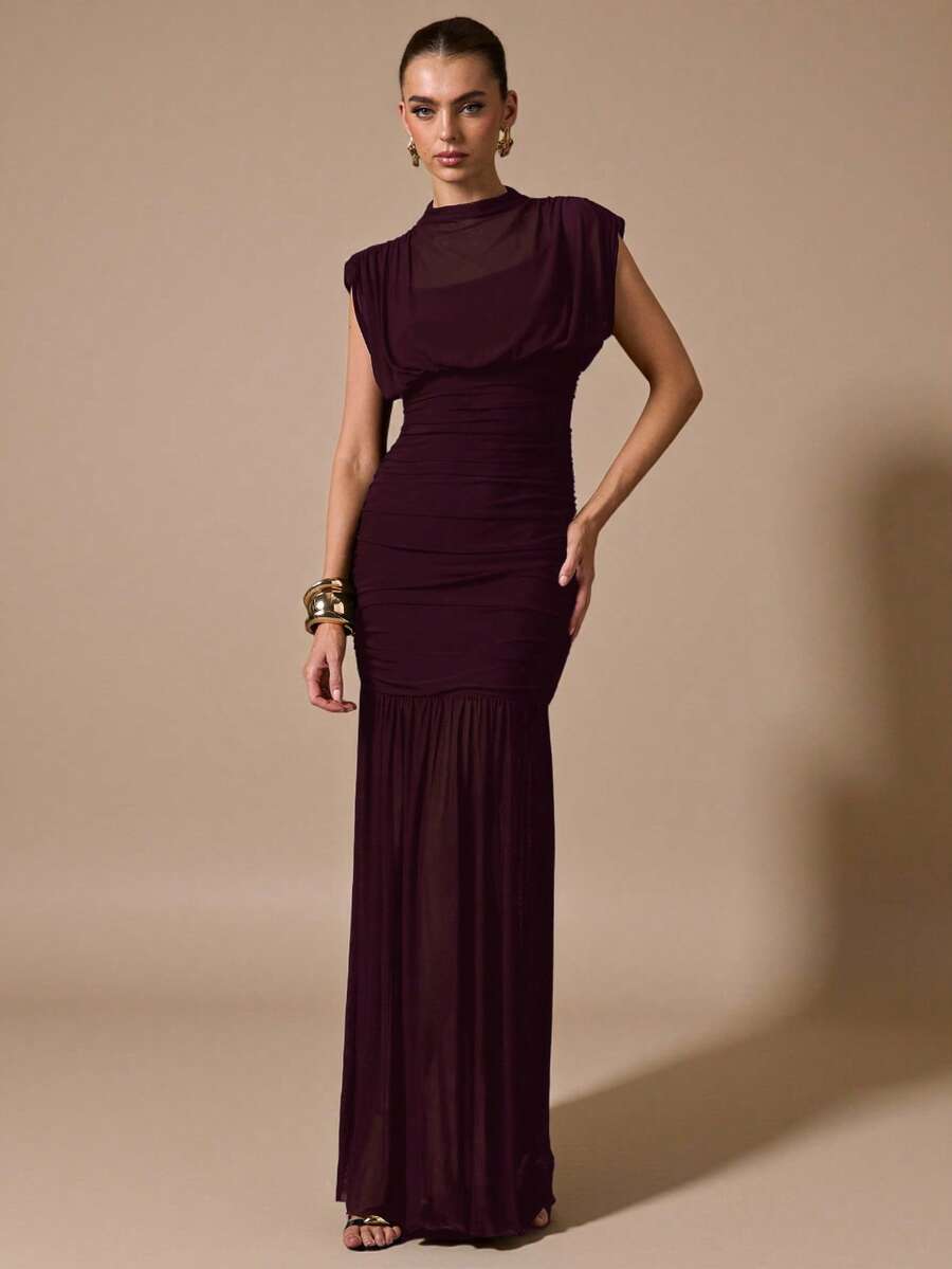 فستان ماكسي أنيق من SHEIN BAE بتصميم ملفوف، شفاف مجعد، مع تفاصيل ثنيات وطوق كشكش وسستة