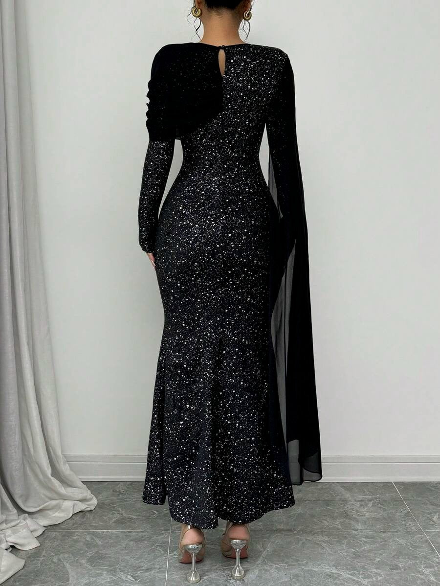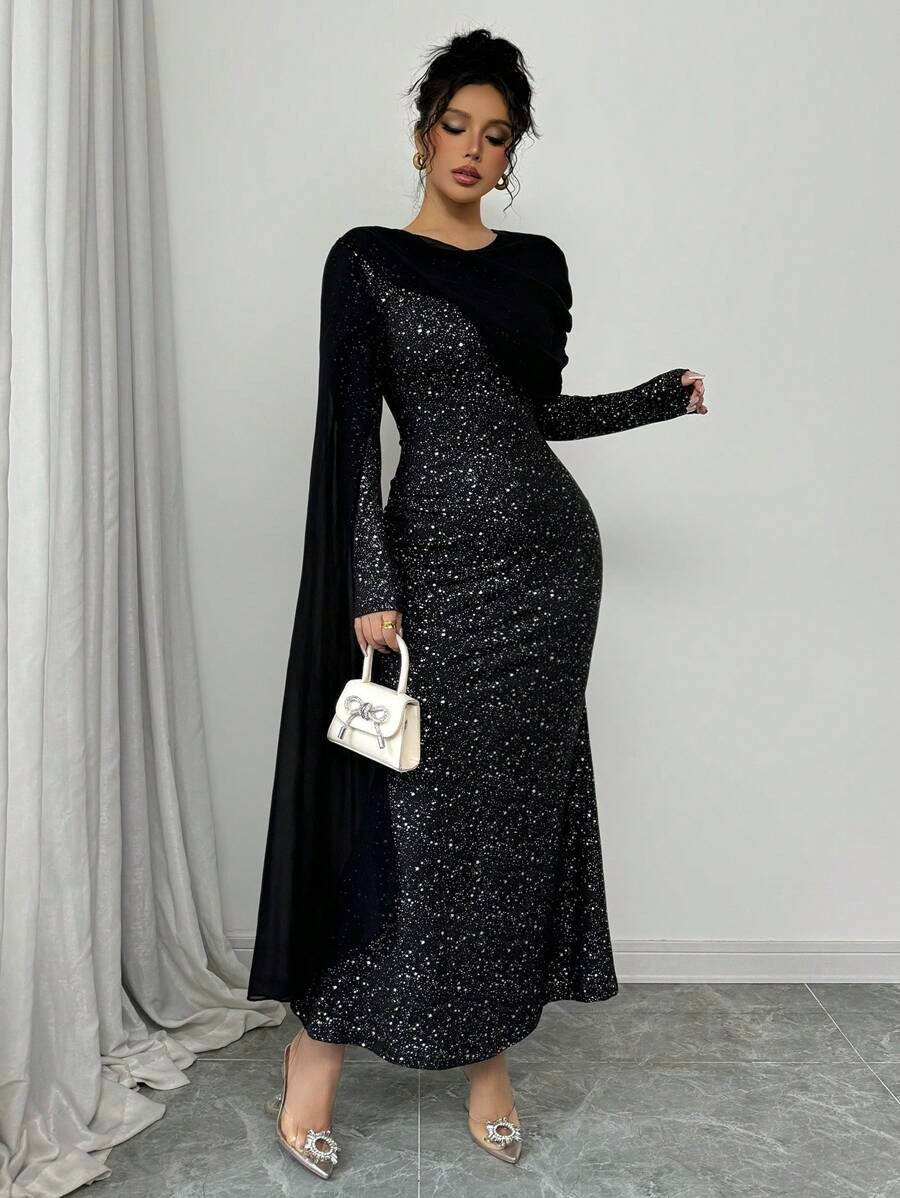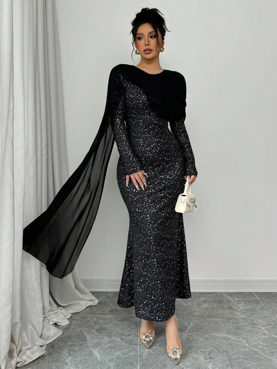 SHEIN Chiquease فستان سهرة أسود مزين بفصوص لامعة