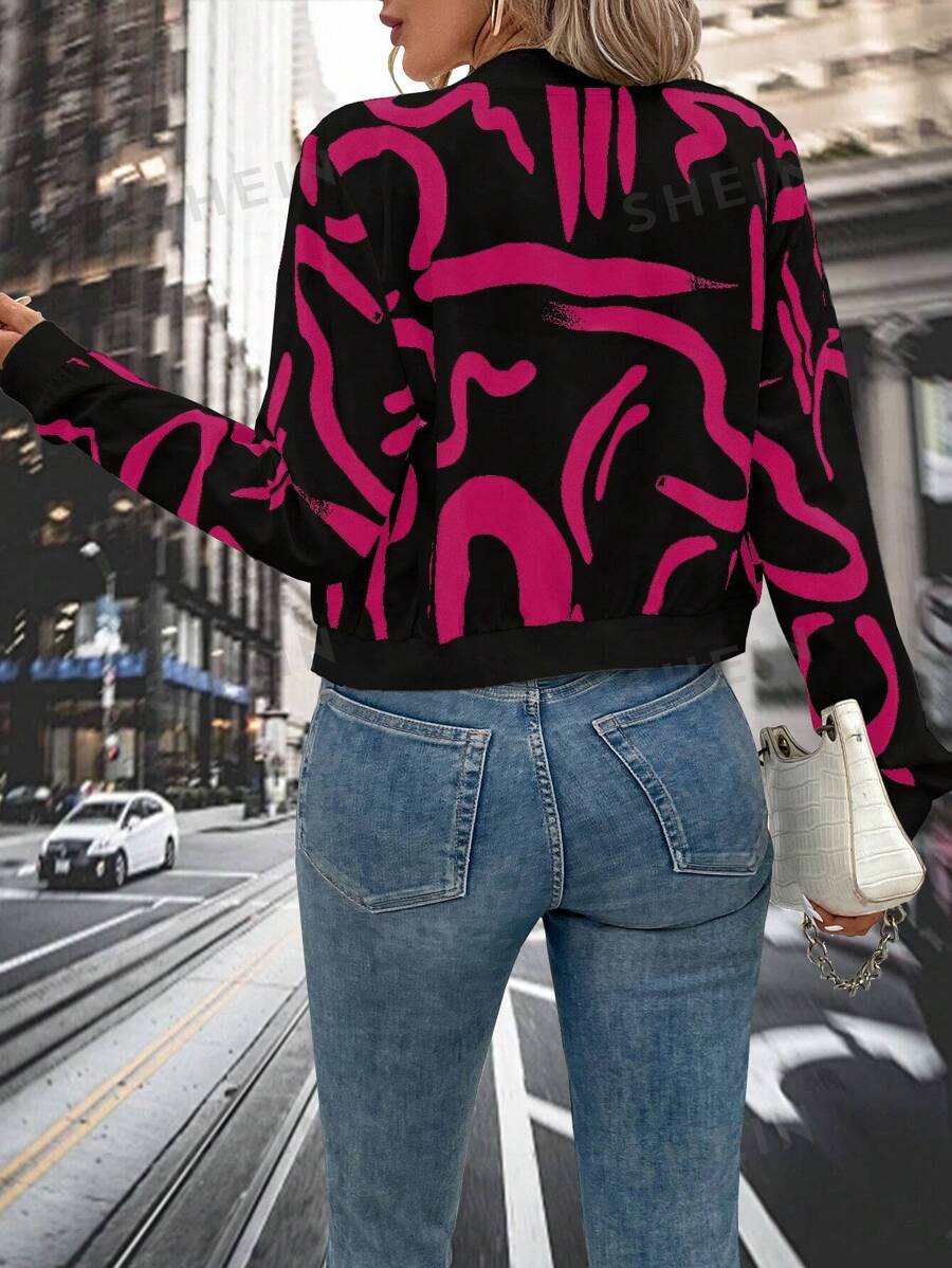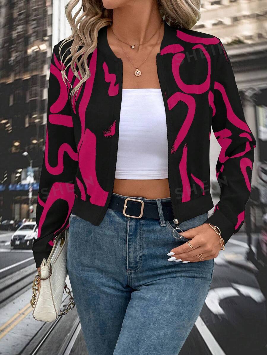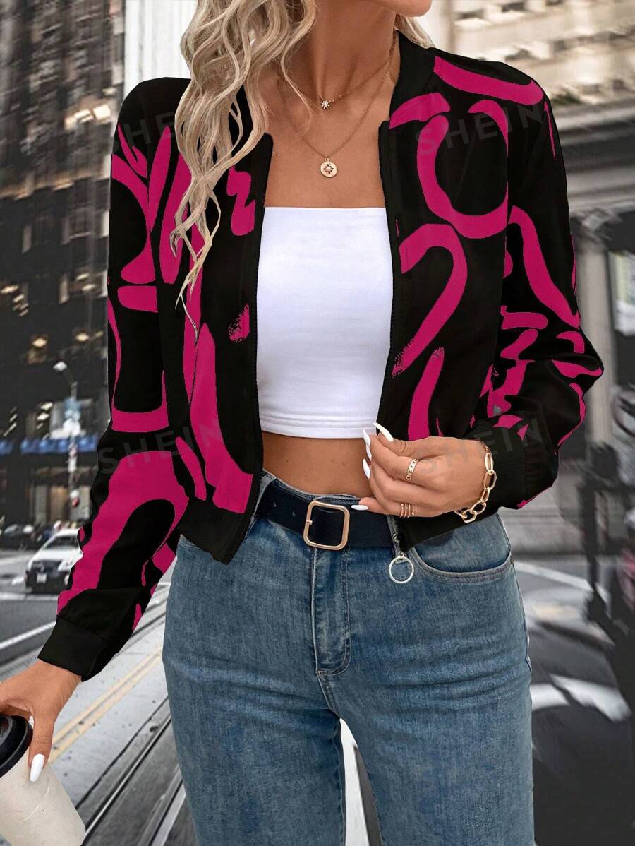 SHEIN Clasi جاكيت نسائية بيسبول قصيرة بياقة زهرية