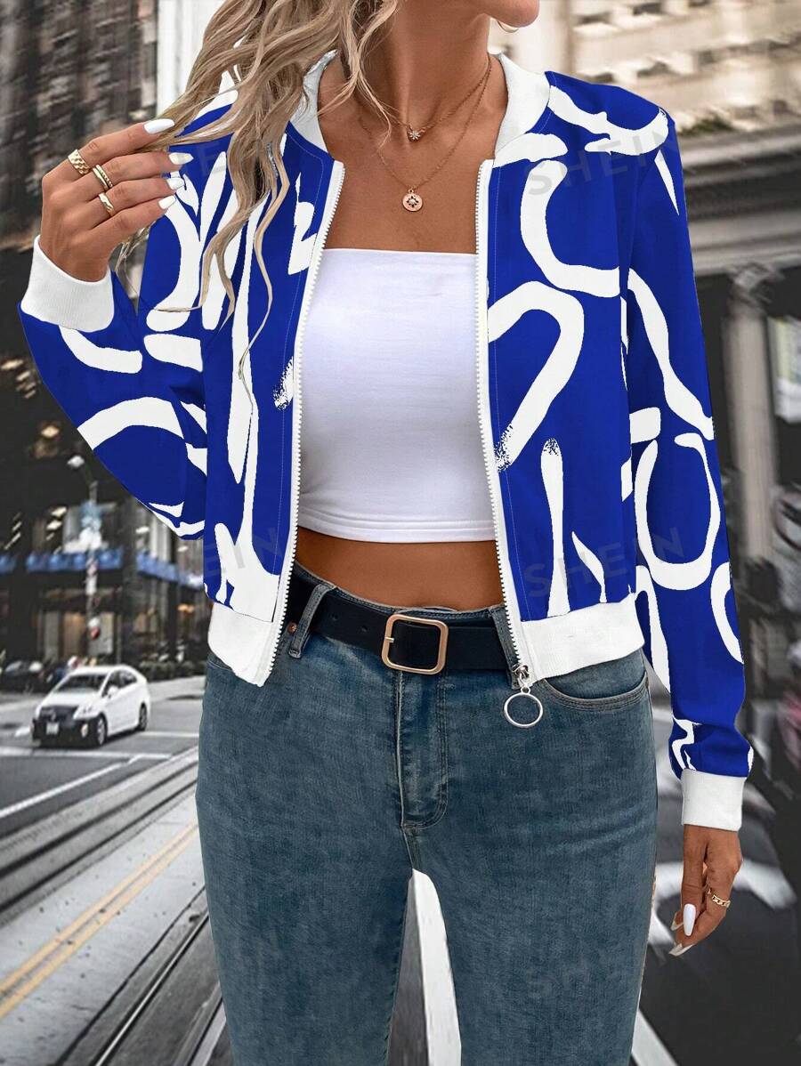 SHEIN Clasi جاكيت نسائي بأكمام طويلة بسحاب بالألوان المتضاربة وطبعة بسيطة