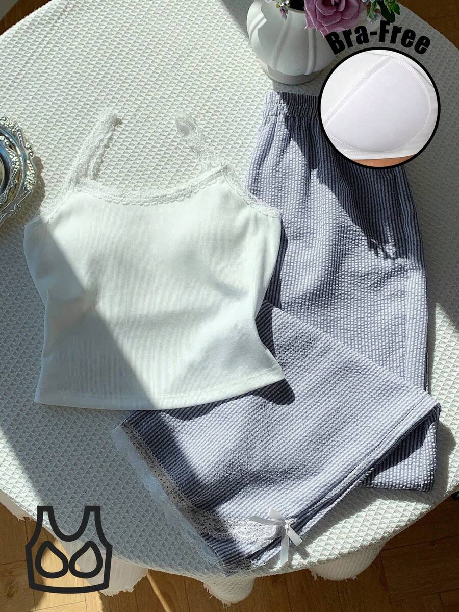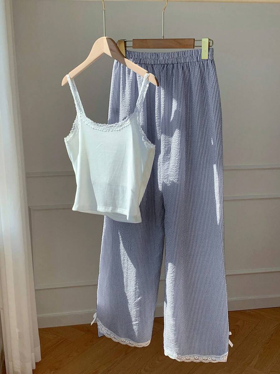 SHEIN Comfortcana طقم 2 قطع توب كاميسول دانتيل وبنطلون مخطط