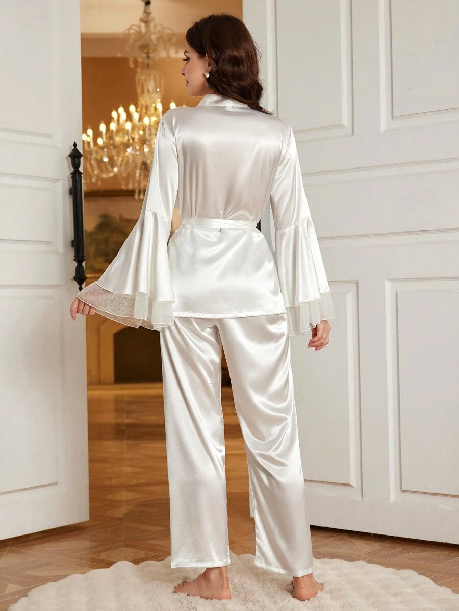 SHEIN Crystal Vow طقم بيجامة 2 قطعة أكمام واسعة بحزام من قماش حرير