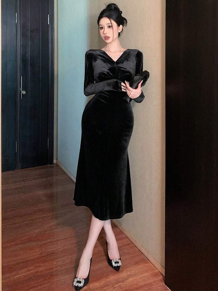 DAZY — فستان طويل من المخمل الأسود بياقة V وذيل سمكة أنيق 🖤✨
