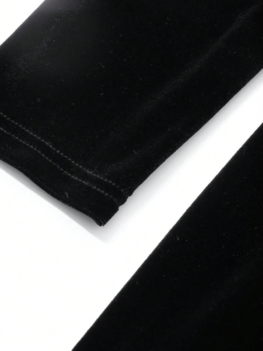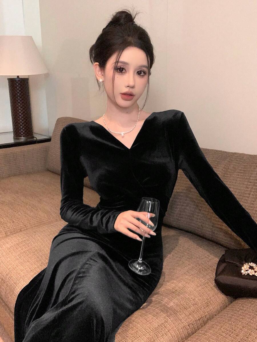SHEIN DAZY فستان أسود طويل بأكمام طويلة من القطيفة