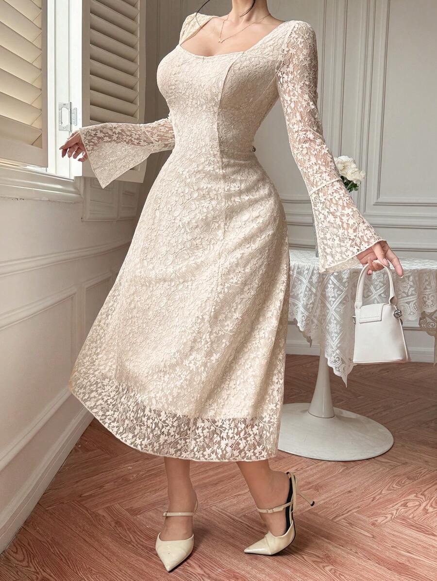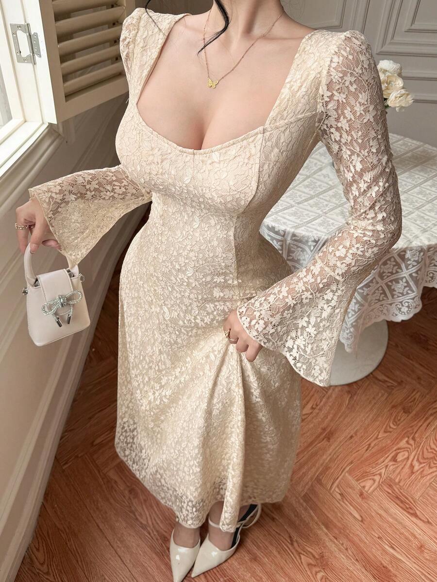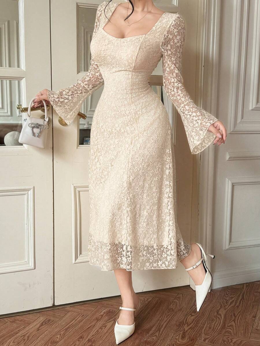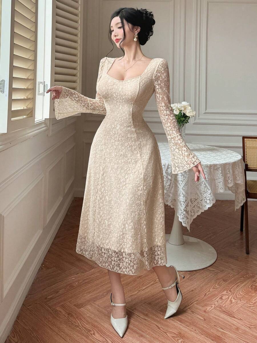 SHEIN DAZY فستان بيج دانتيل بياقة وأكمام واسعة أنيقة