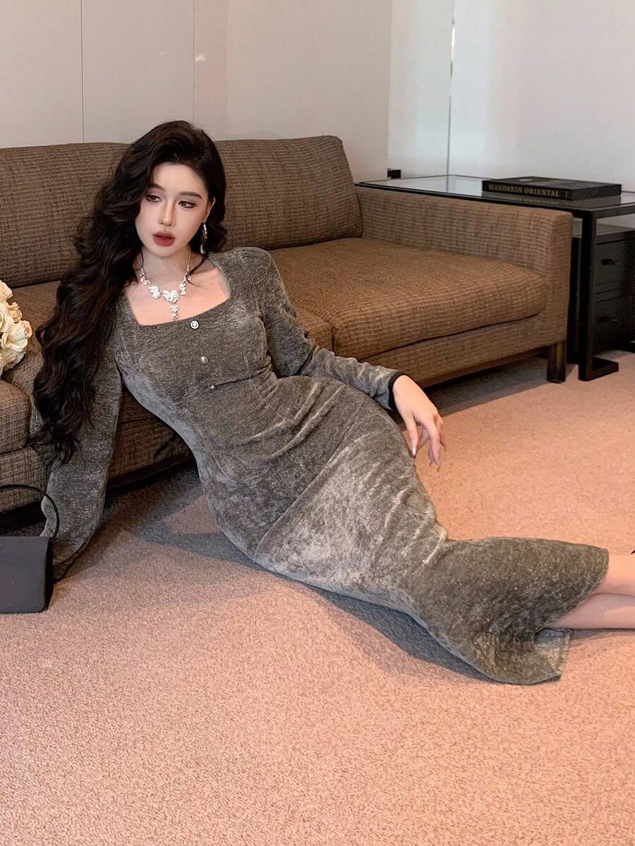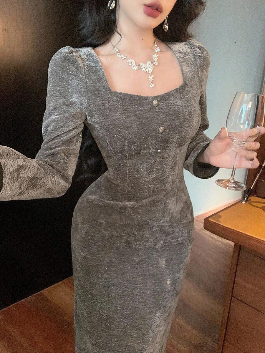 فستان كوكتيل أنيق مناسب للجسم مع إبزيم معدني مخملي، أكمام منتفخة عصرية وطول طويل، مثالي لفصلي الخريف والشتاء والحفلات والسهرات والزفاف.المواصفات: