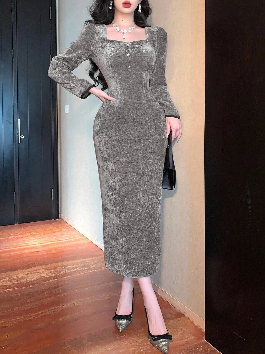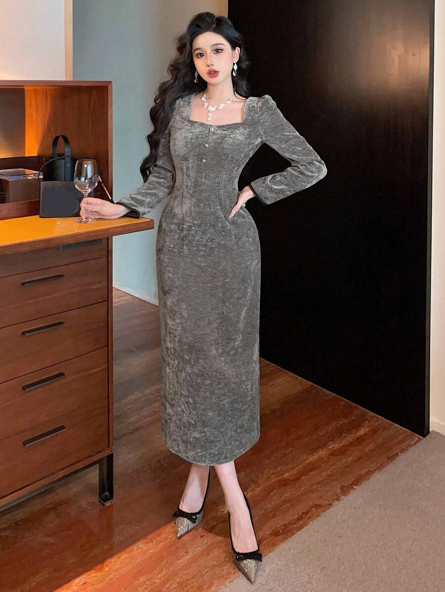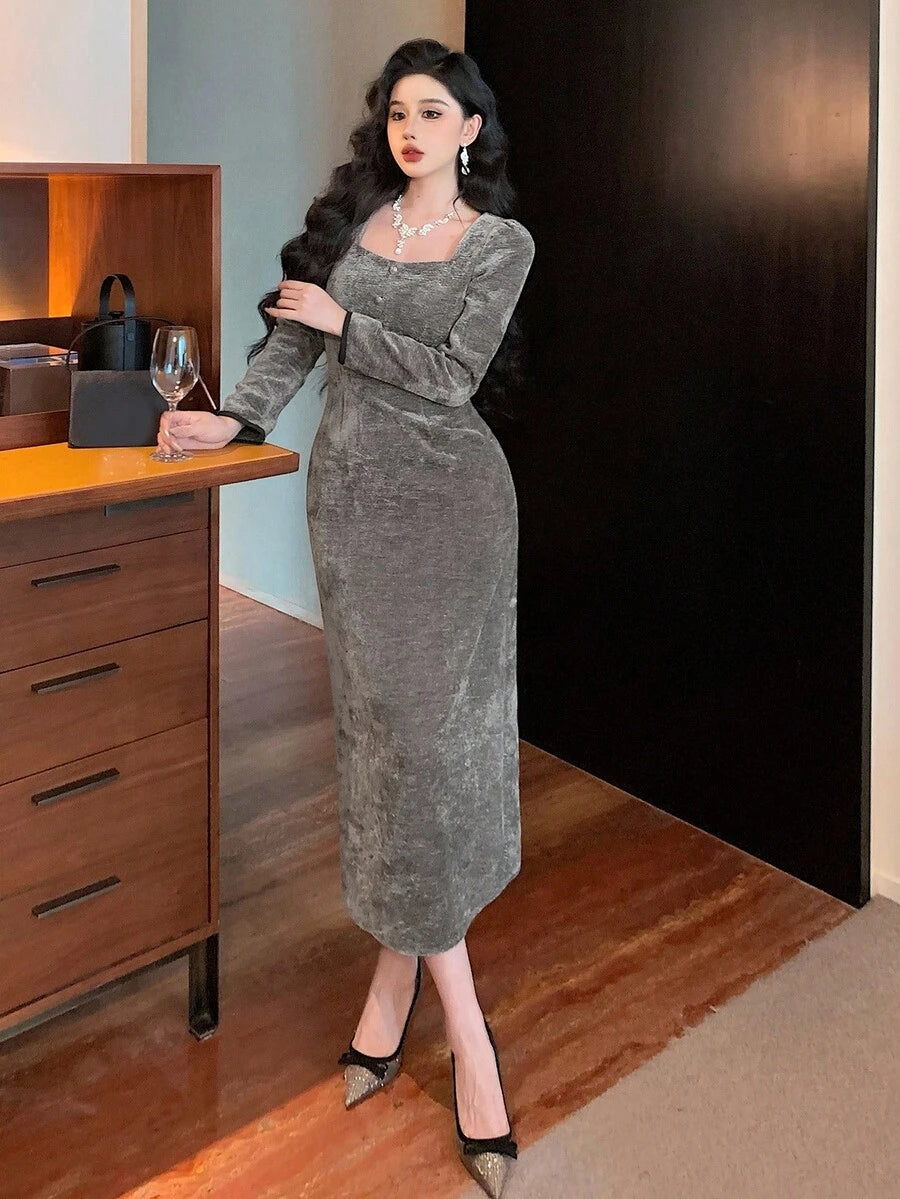 SHEIN DAZY فستان رمادي طويل وزخرفة إبزيم معدني