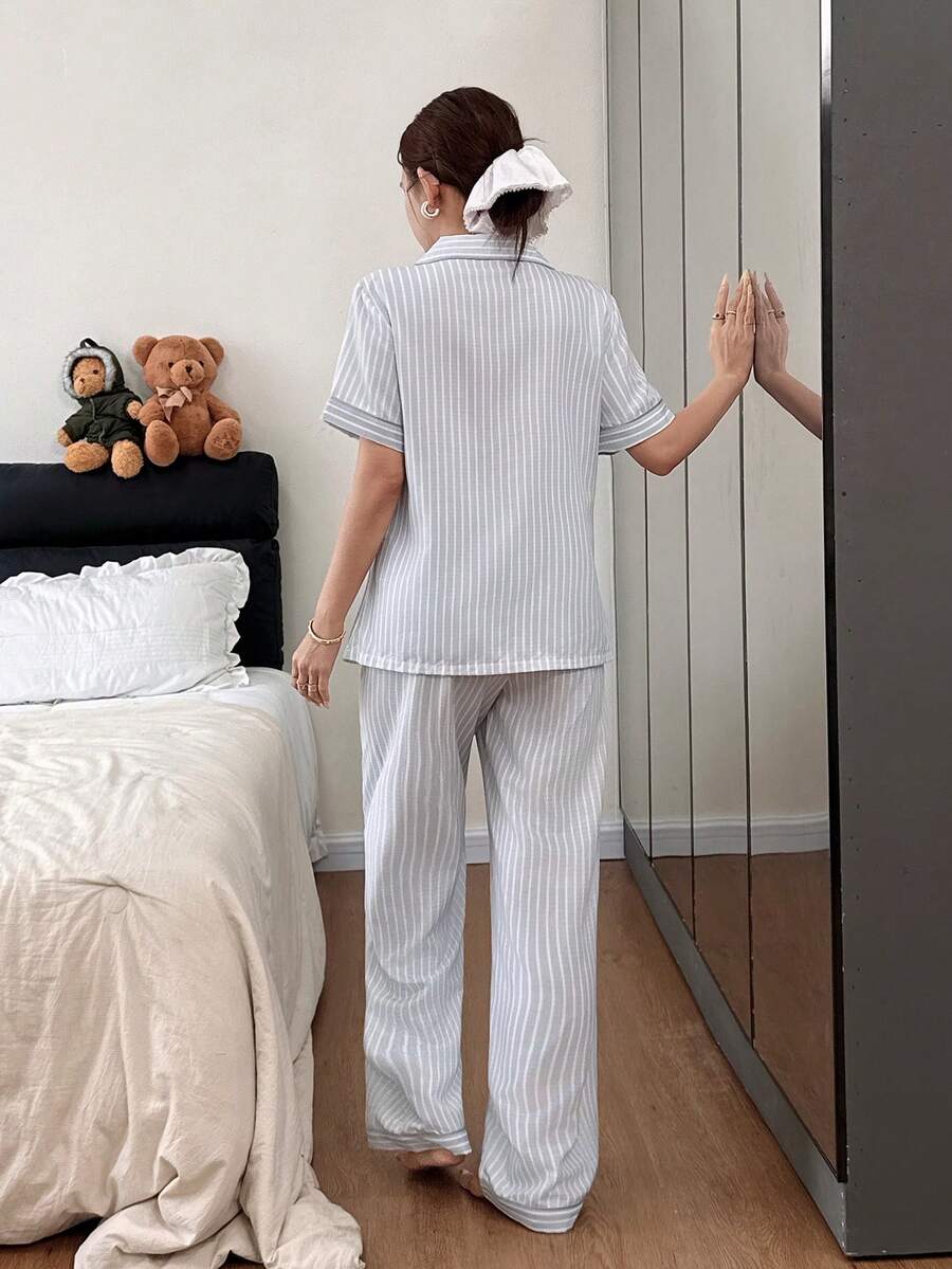SHEIN Dream Adore طقم بيجامة كلاسيكي بياقة مخططة وأكمام قصيرة