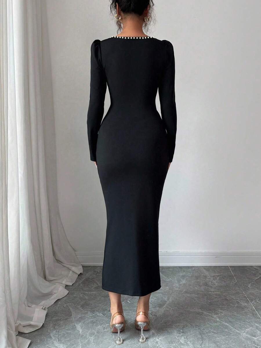SHEIN Elenzga فستان اسود بأكمام طويلة بياقة من اللؤلؤ