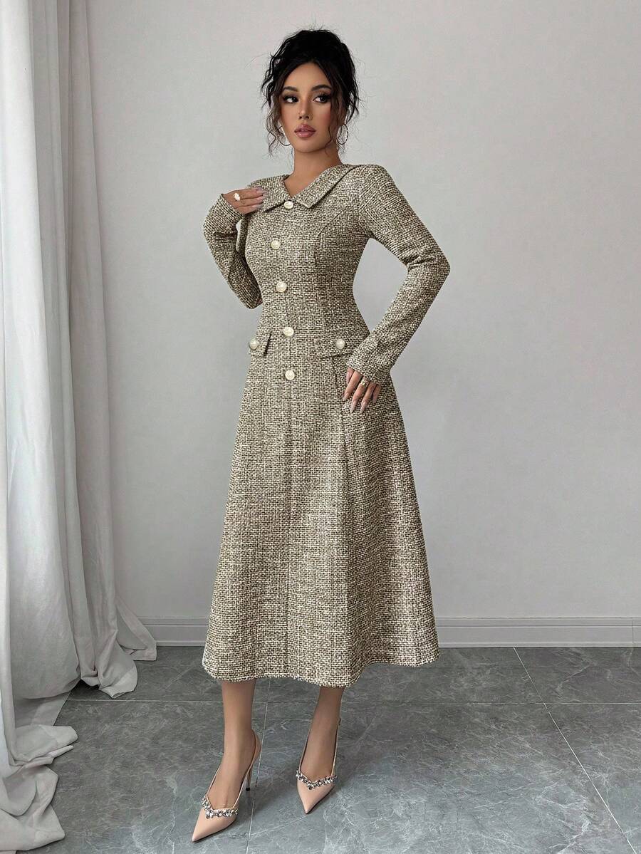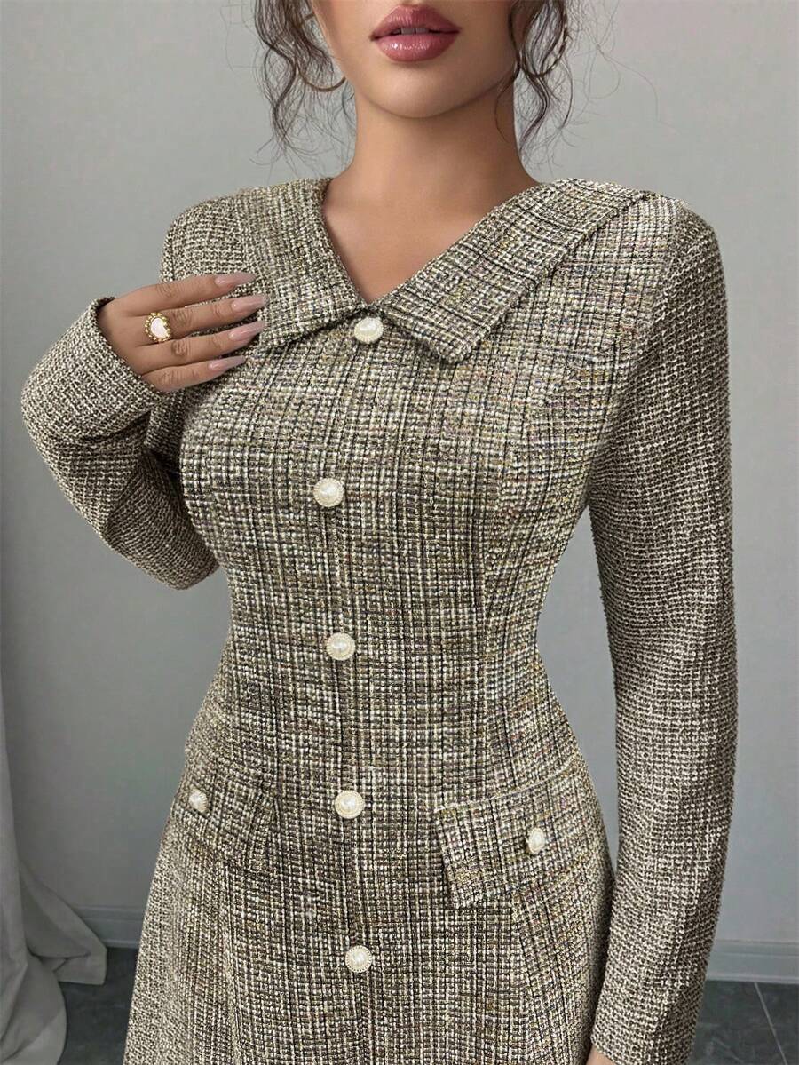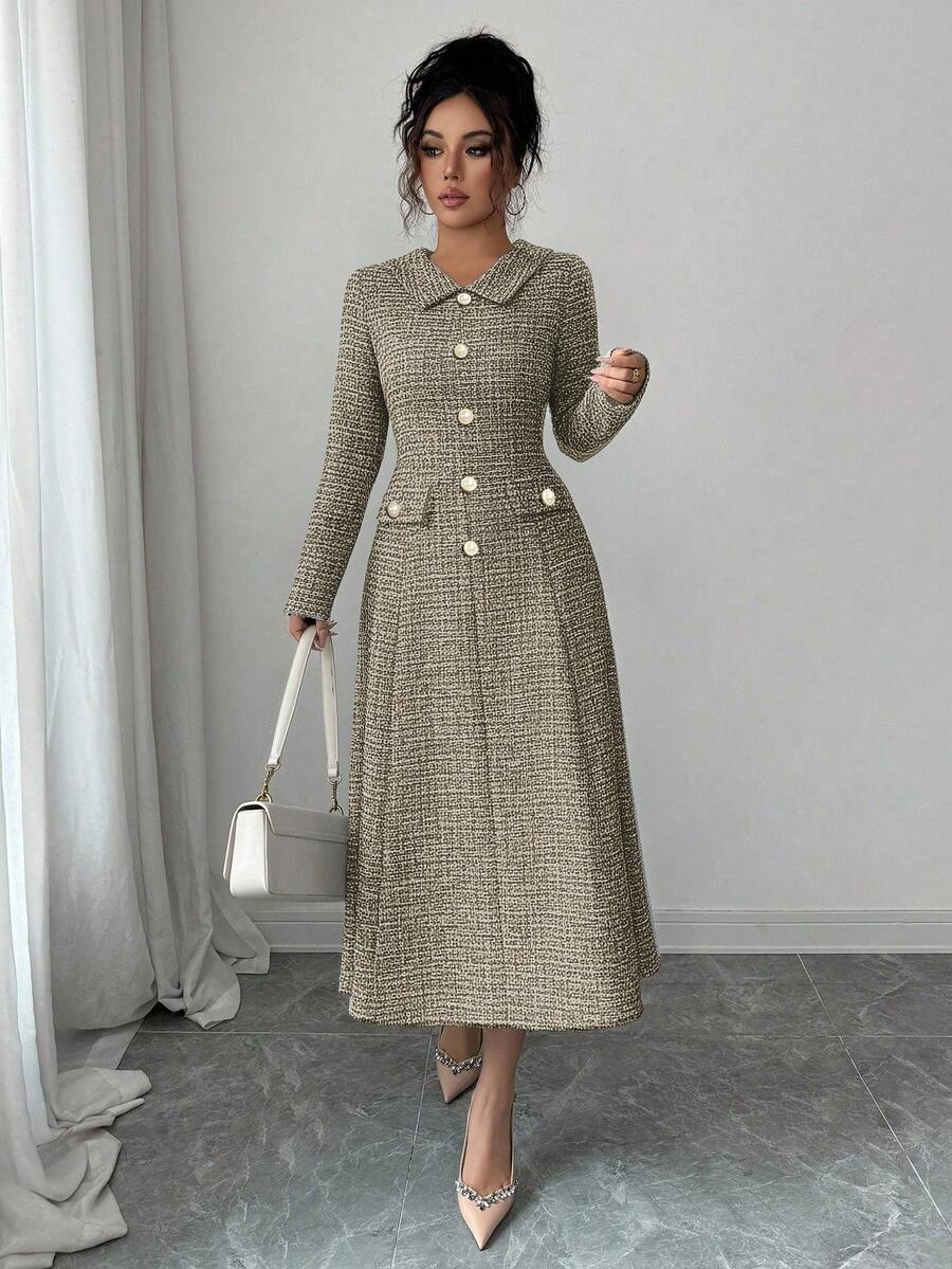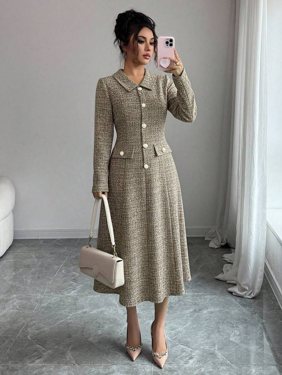 SHEIN Elenzga فستان بخصر مشدود بأزرار لؤلؤية وأكمام طويلة