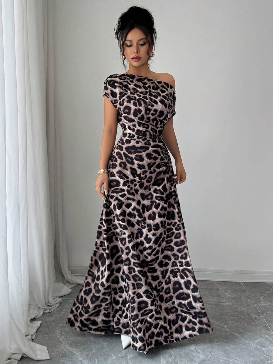 SHEIN Elenzga فستان بني بطبعة نمرية بكتف غير متماثل وخصر مطوي