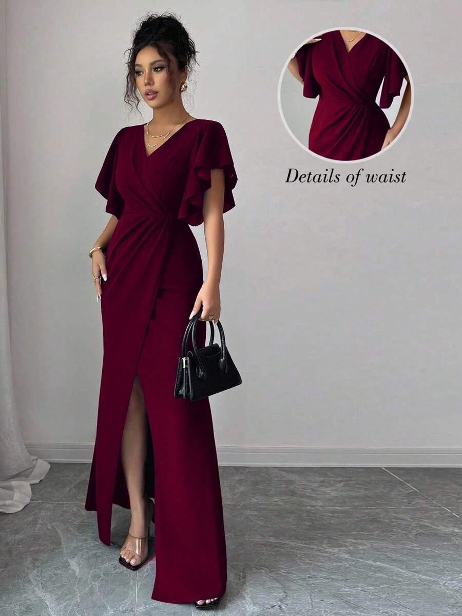 فستان ماكسي بلون عنابي مع ياقة على شكل V وأكمام مكشكشة، قصة ضيقة بذيل على شكل حورية البحر، مثالي لحفلات الزواج والمناسبات الخاصة.