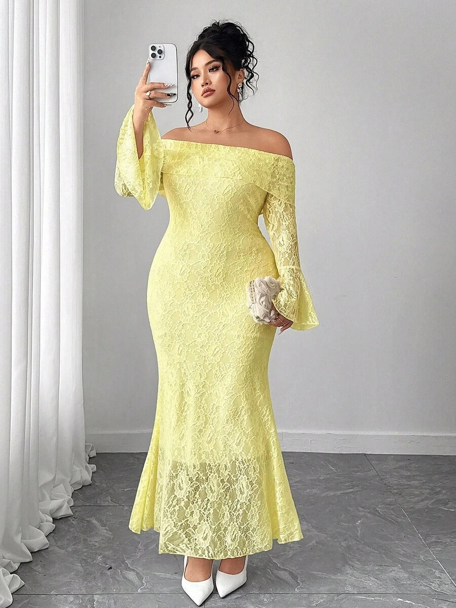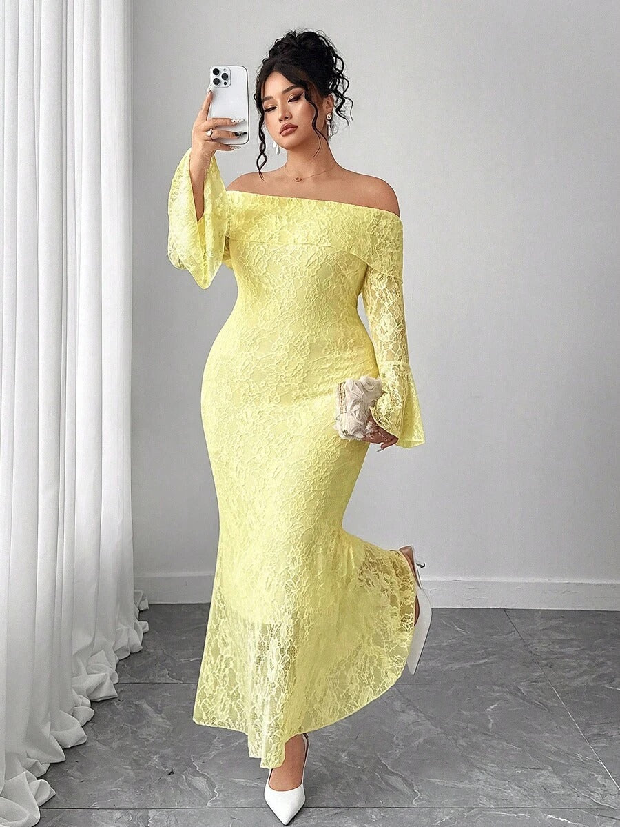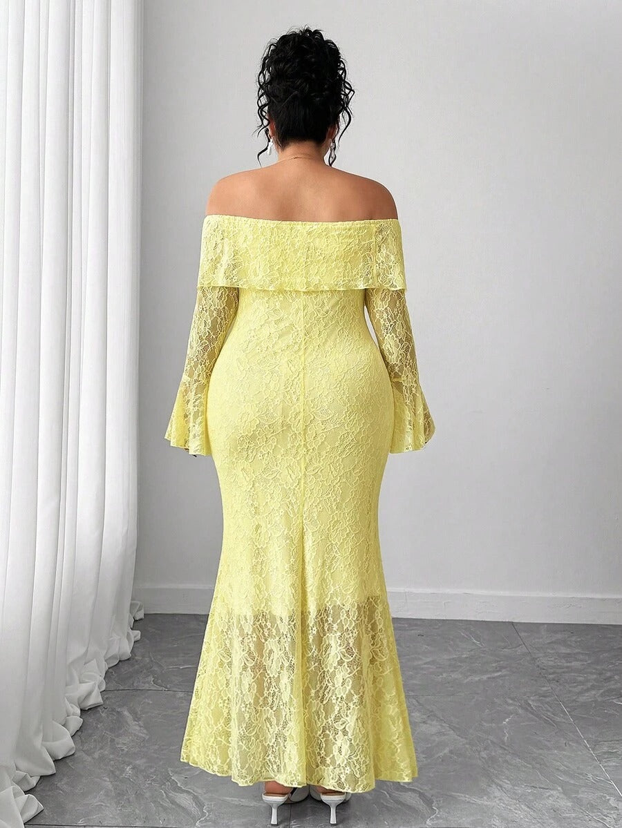 SHEIN Elenzga فستان طويل مكشوف الكتف مزين بالدانتيل والزهور بلون أصفر